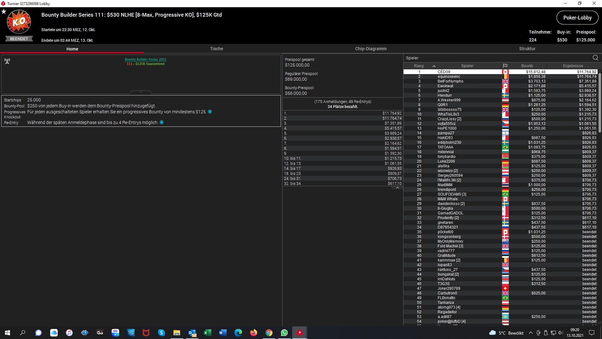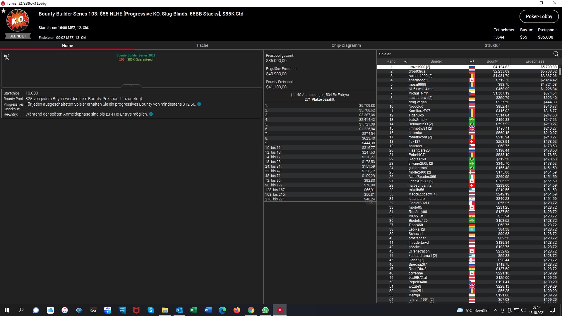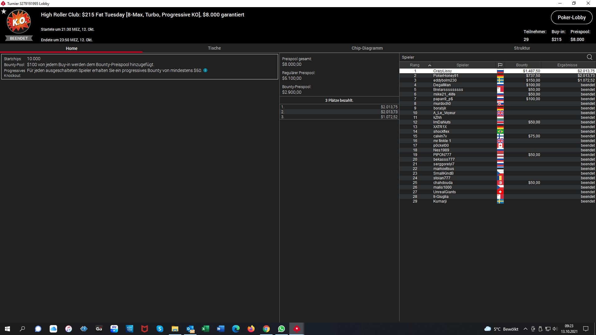 Beim $109 NLHE 7-Max PKO Side Event belegte der Österreicher „CPUrur“ den Platz 2 und durfte sich über $5.561 + $2.490 Bounties freuen.