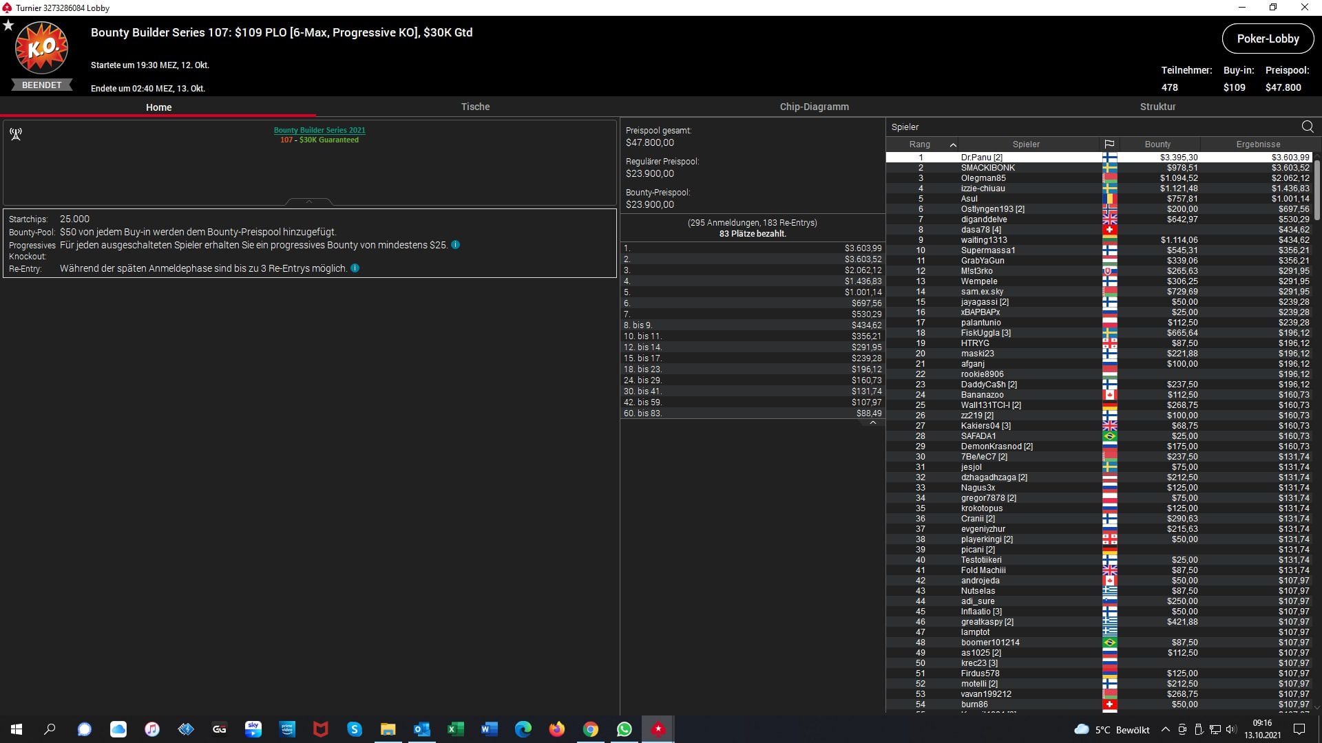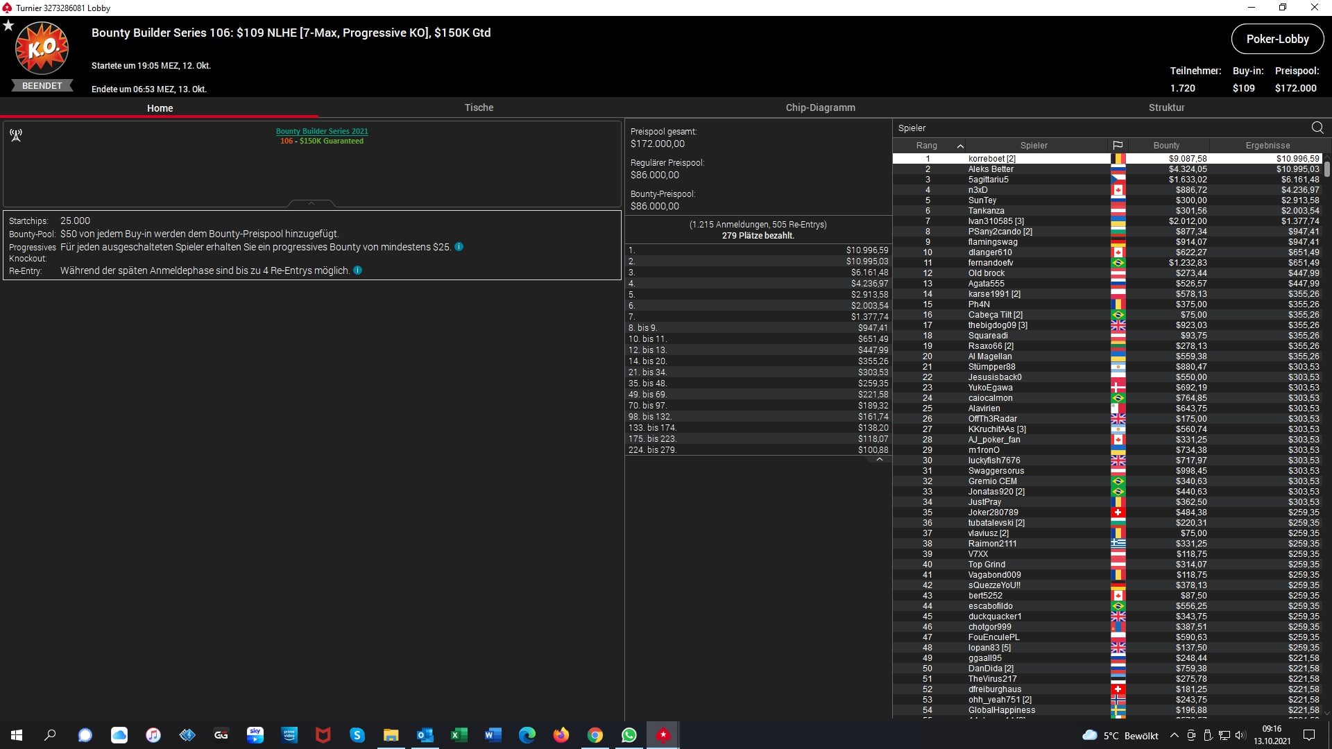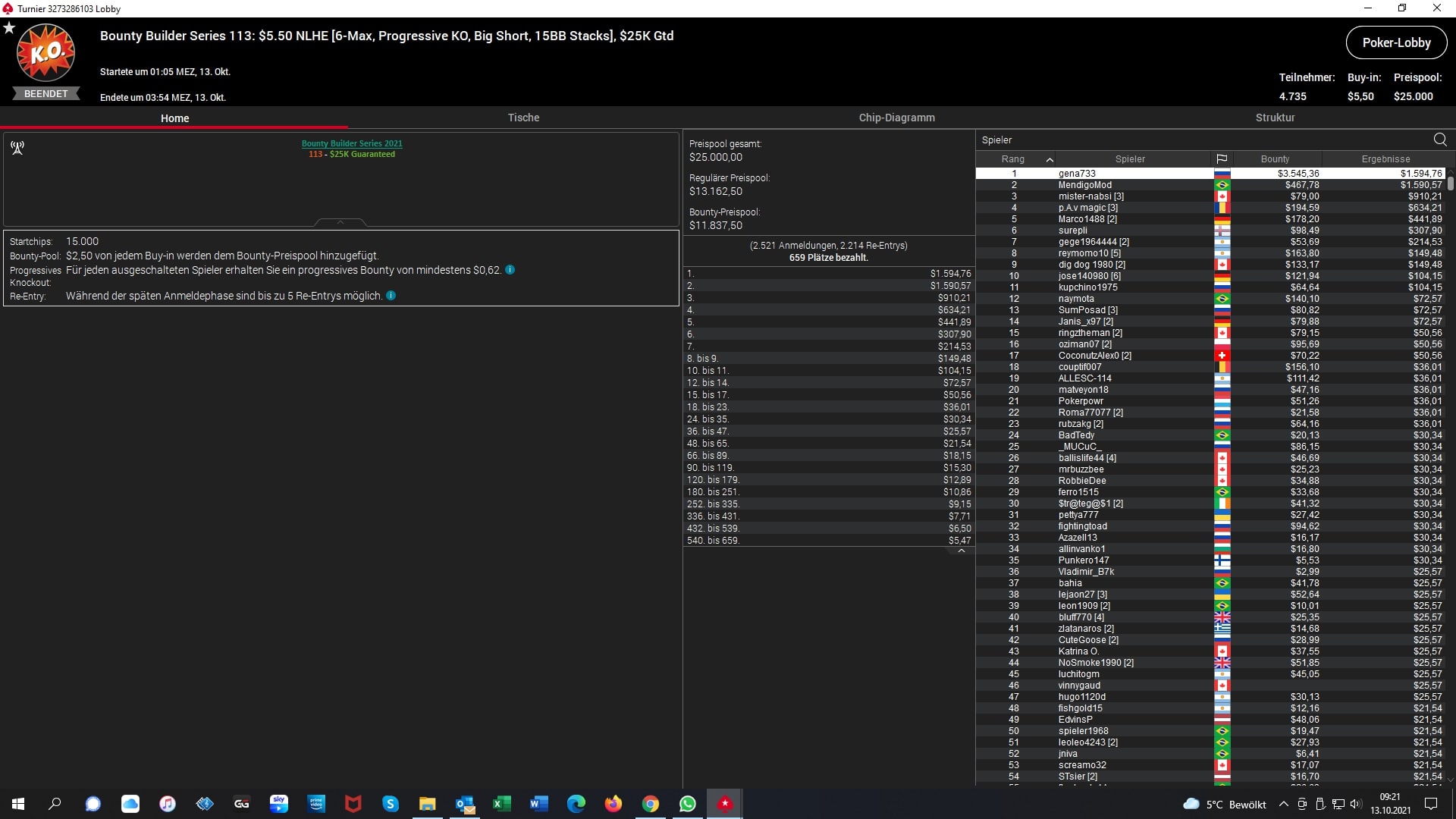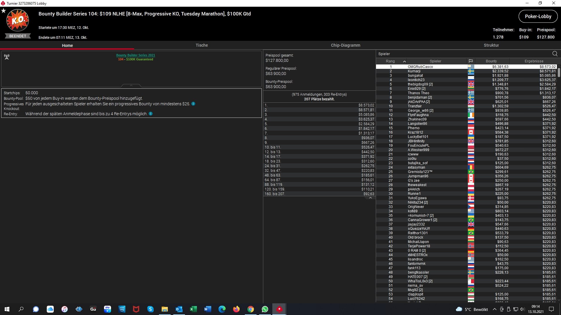 Beim $109 NLHE 7-Max PKO Side Event belegte der Österreicher „CPUrur“ den Platz 2 und durfte sich über $5.561 + $2.490 Bounties freuen.