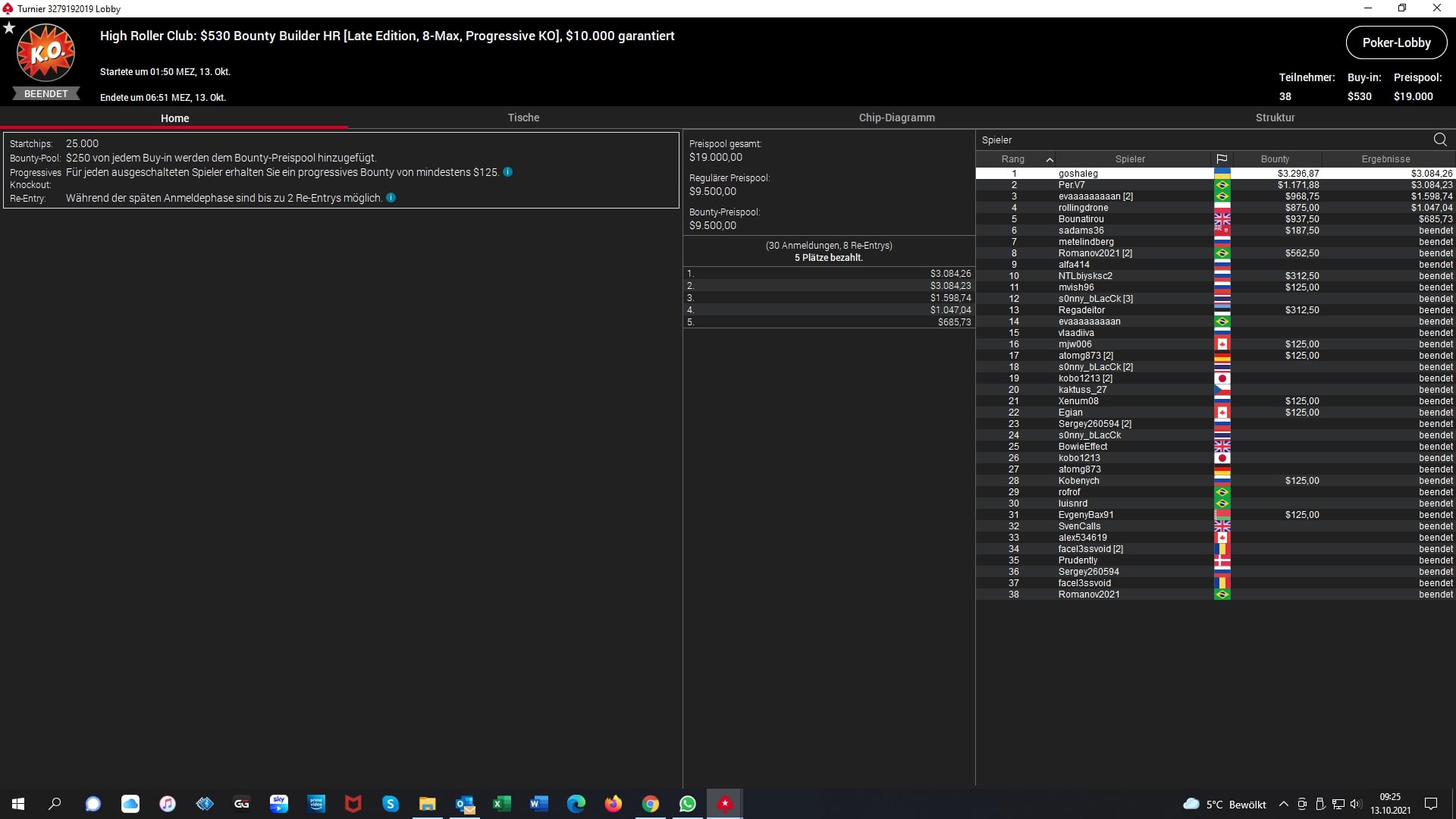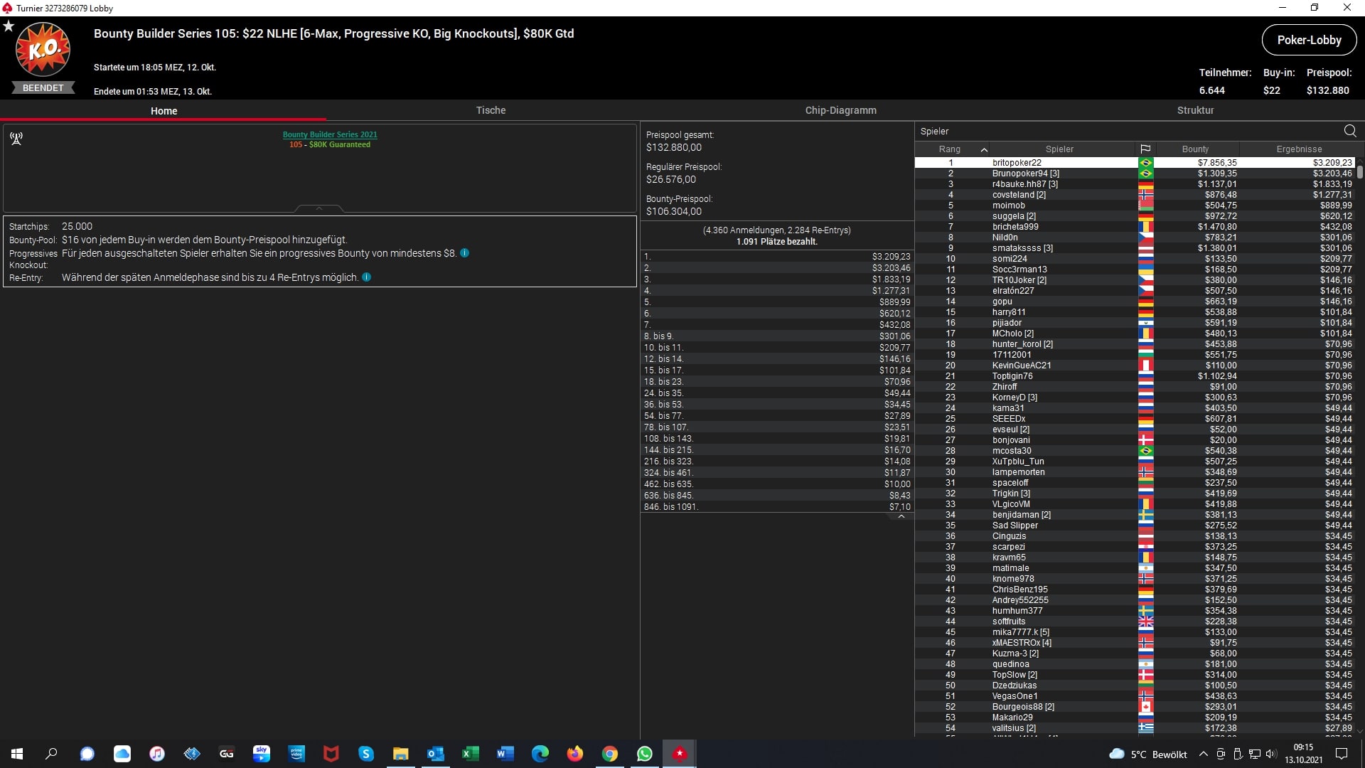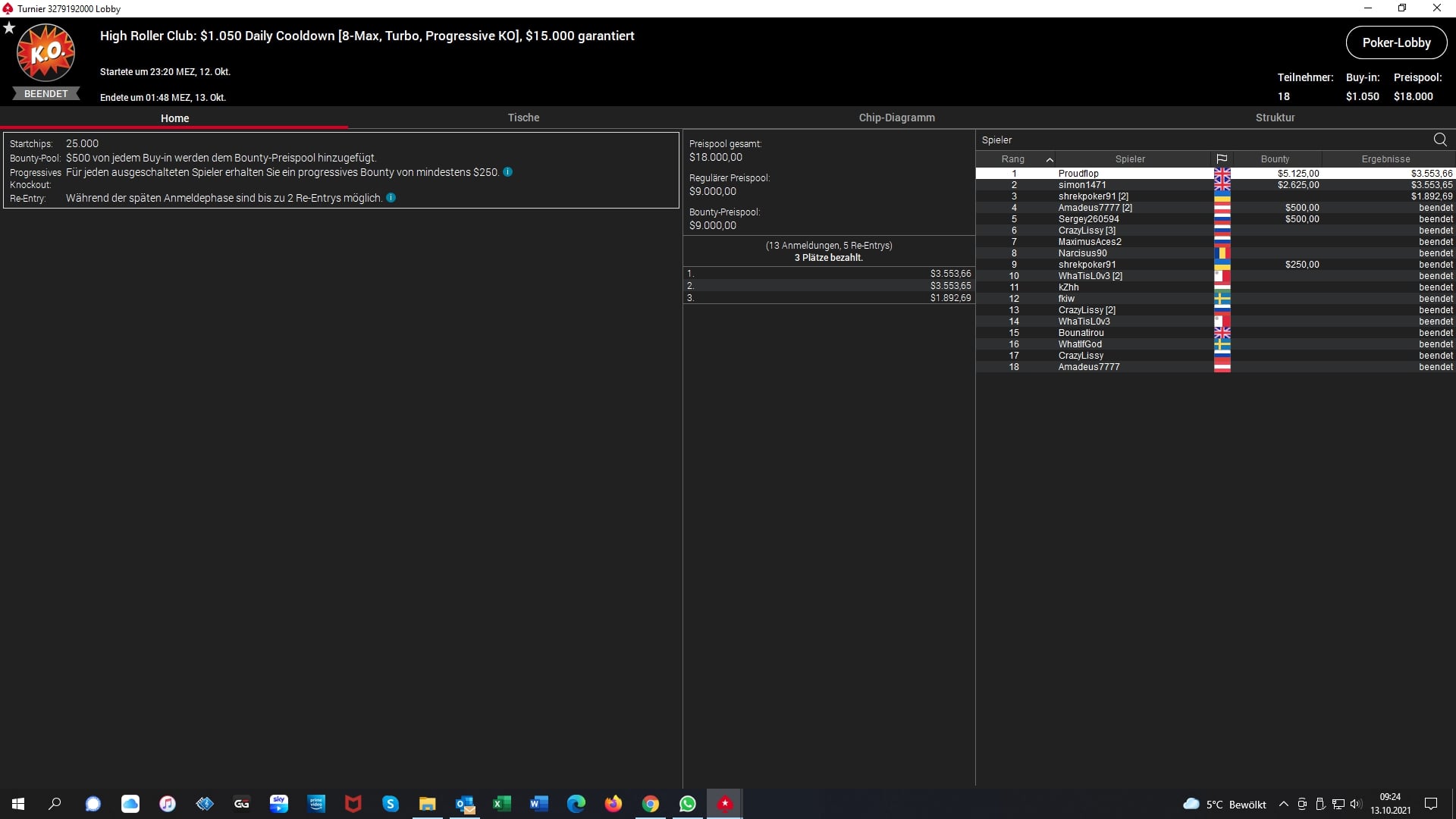 Die deutschsprachigen Teilnehmer durften sich hier über drei Medaillen freuen. Der Deutsche „Vidiciara“ konnte sich beim $11 NLHE PKO Event #111 durchsetzen und den Sieg sowie $3.223 + $2.505 Bounties abräumen. „r4bauke hh87“ (GER) sicherte sich beim $22 NLHE 6-Max PKO Event #105 den Platz 3 und $3.203 + $1.137 Bounties. Bronze gab es ebenfalls für „SLeiti“ aus Österreich beim $55 NLHE 8-Max PKO Event #109, wo er mit $4.249 + $1.167 Bounties entlohnt wurde.
