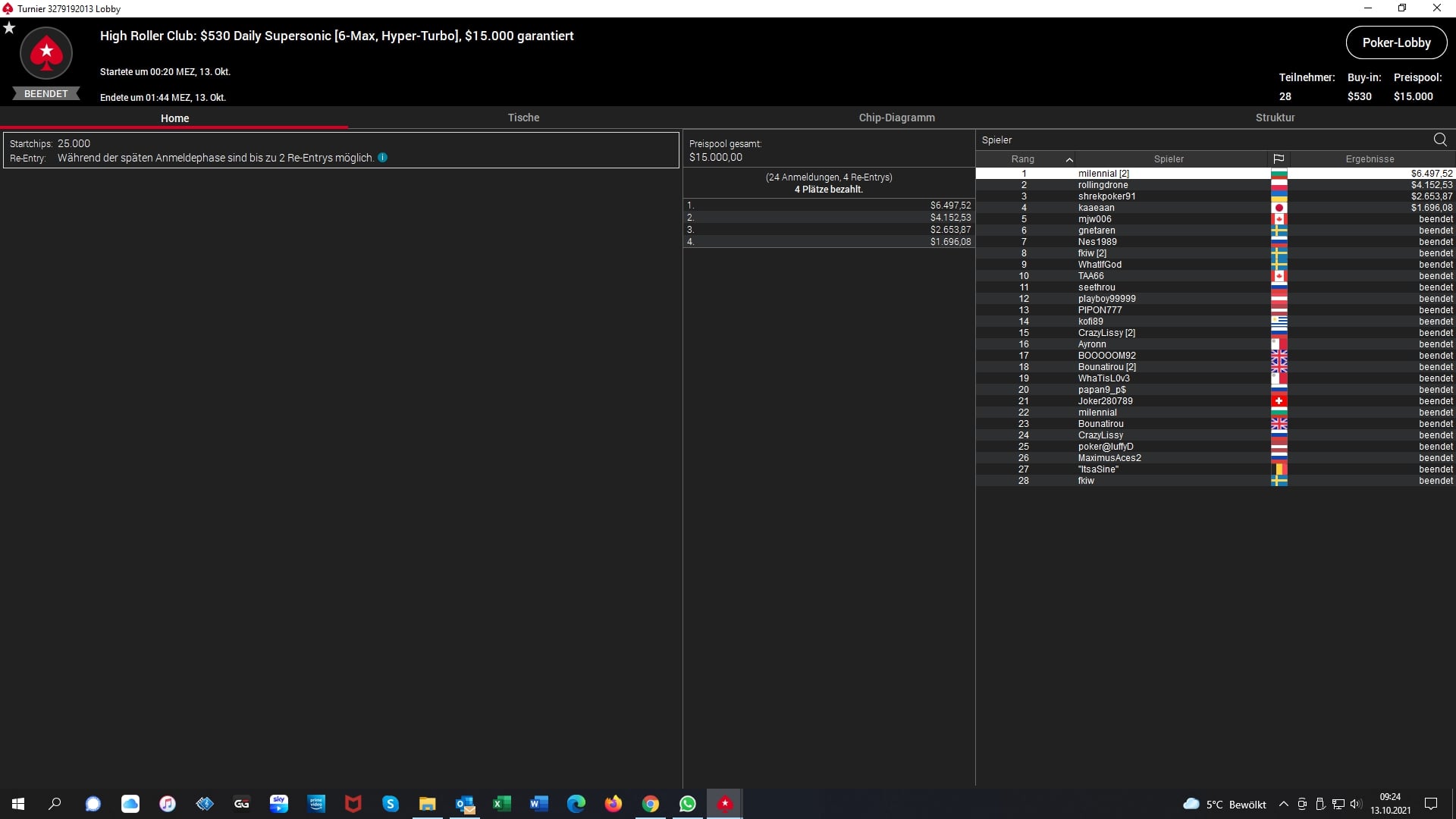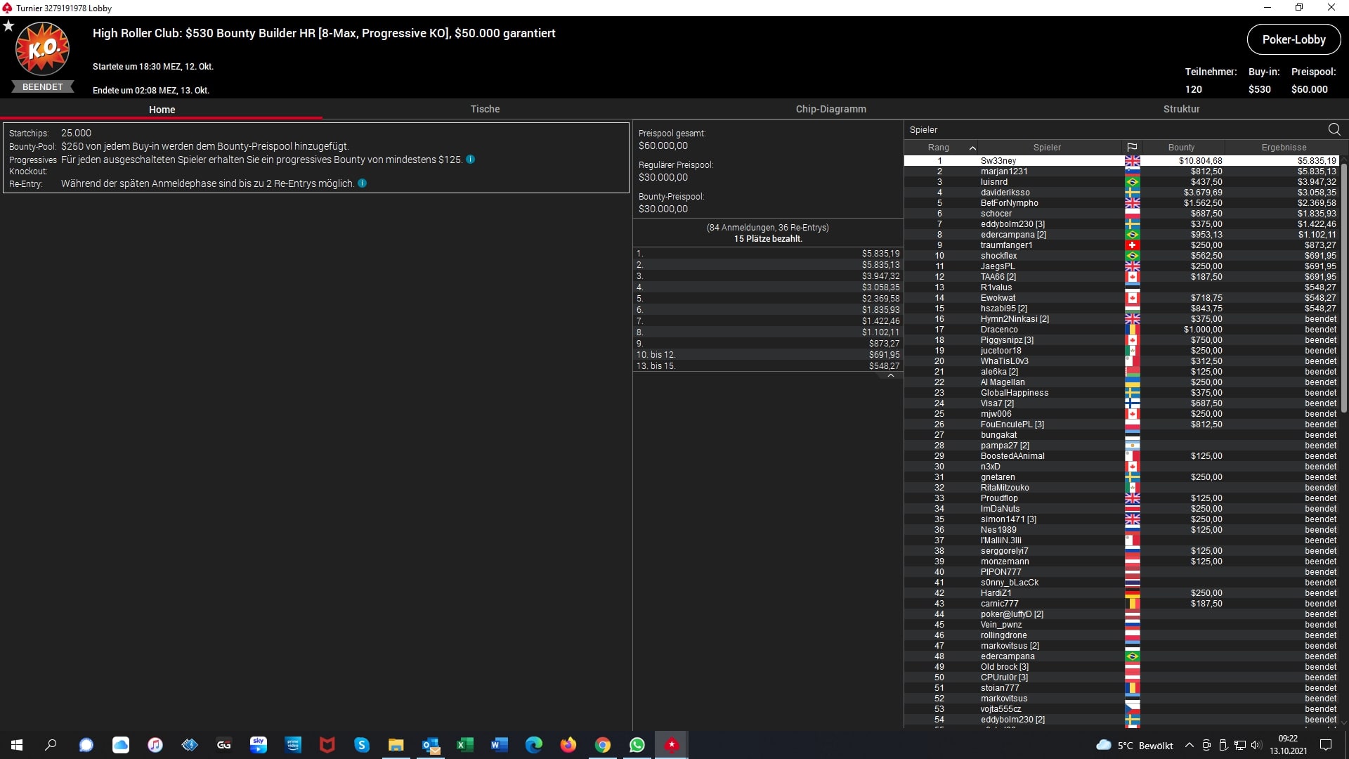Im High Roller Club war am Dienstag nicht viel los. Aus Sicht der DACH-Spieler konnte nur „Poker Honey91“ aus Deutschland auf sich aufmerksam machen. Er holte sich Platz 2 und $2.013 + $737 Bounties beim $215 Fat Tuesday. Das größte Preisgeld des Tages konnte sich im High Roller Club der Brite „Sw33ney“ mit $5.835 + $10.804 Bounties beim $530 Bounty Builder High Roller sichern.