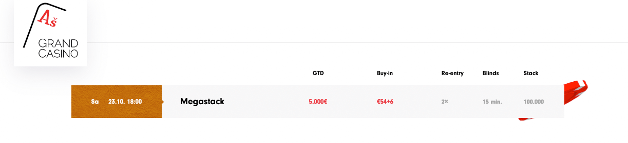 Heute findet im Grand Casino Aš das Megastack-Turnier statt, bei dem um 18:00 Uhr bei einem €54+6 Buy-In eine €5.000 Garantie versprochen wird. Zwei Re-Entries sind erlaubt, die Spieler starten mit 100.000 Startstack bei 15 Min Level.