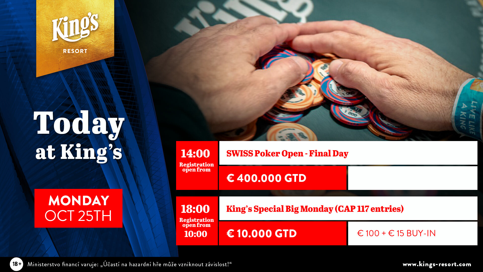 Heute steht im King’s Resort neben dem Finale der Swiss Poker Open, das um 14 Uhr beginnt, auch noch um 18 Uhr das King’s Special Big Monday für €115 auf dem Programm.