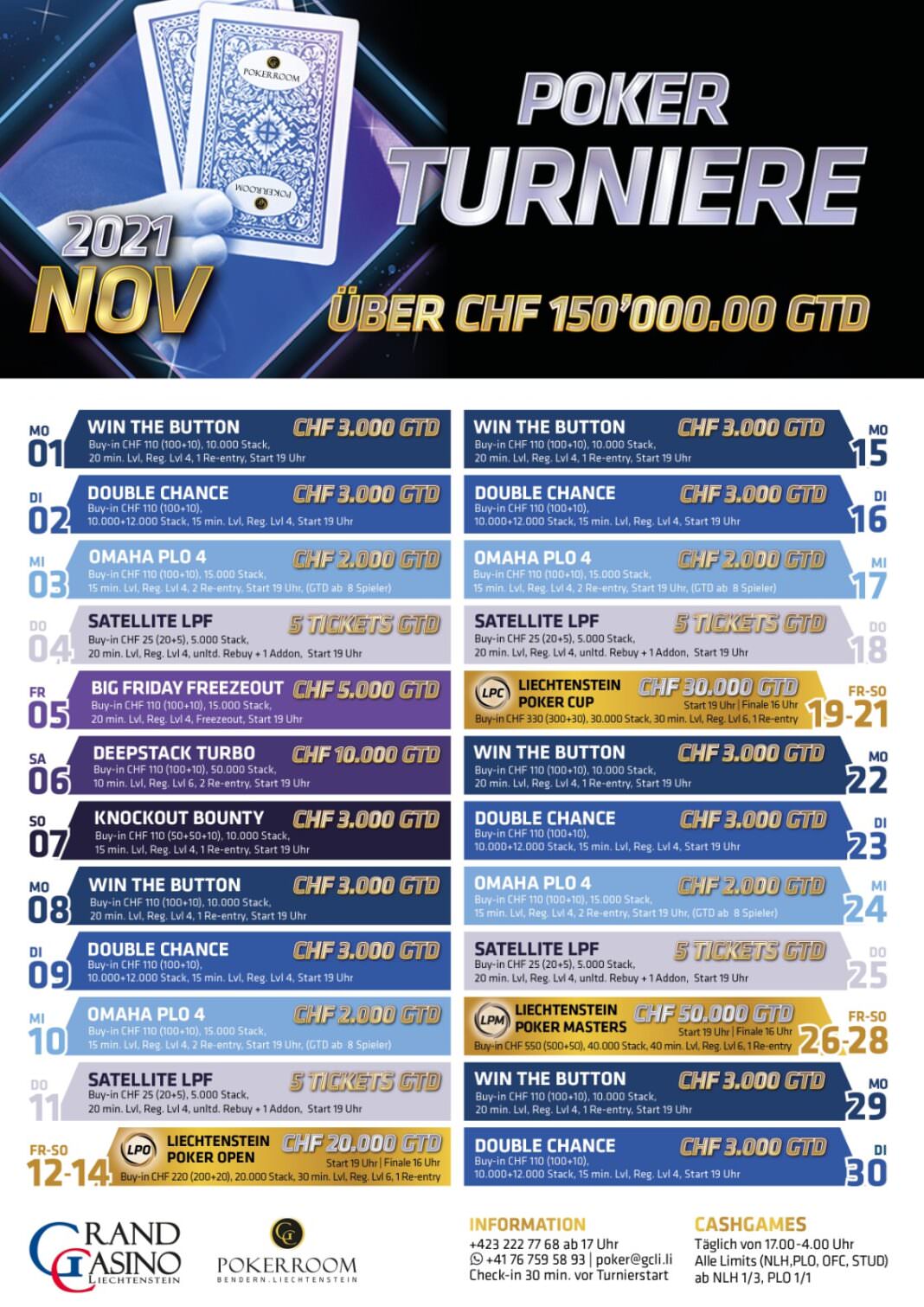 Im Dezember veranstaltet das Grand Casino Liechtenstein die nächste Ausgabe des Liechtenstein Poker Festival. Im Blickpunkt steht dann vom 15. bis zum 21. Dezember der €350+50 LPF Main Event mit einem garantierten Preispool in Höhe von CHF500.000.