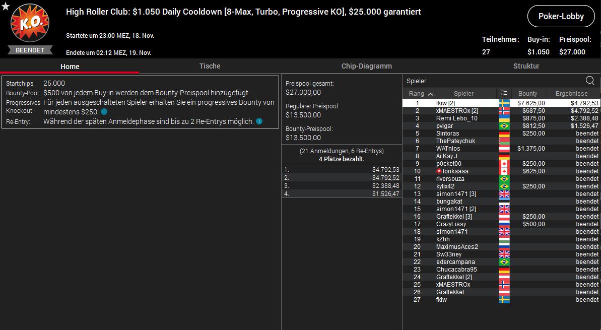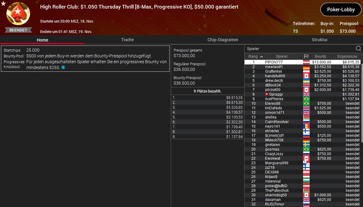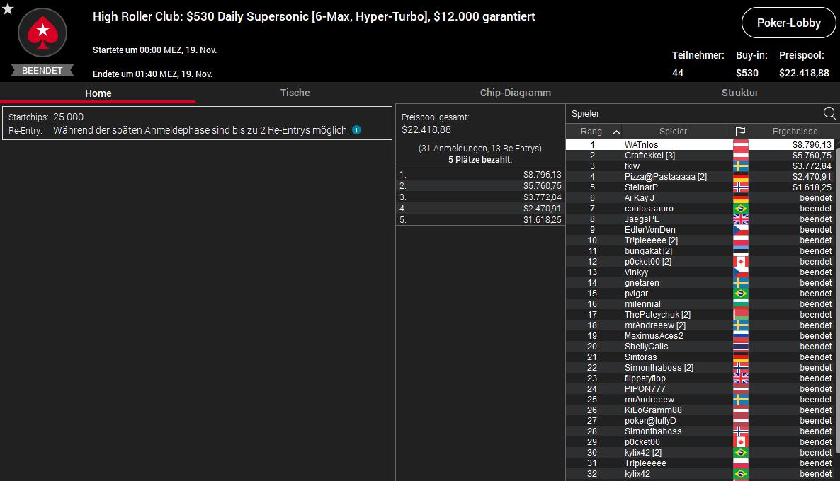 Christian WATnlos Rudolph feierte den Sieg beim $530 Daily Supersonic für $8.796 Prämie, meerwolf belegte beim $1.050 Thursday Thrill Platz zwei für $12.177 (inkl. $3.562,50 in Bounties) und Stefan mindgamer Jedlicka bekam als Dritter beim $530 Bounty Builder HR $8.205 (inkl. $2.421,87 in Bounties) ausbezahlt.