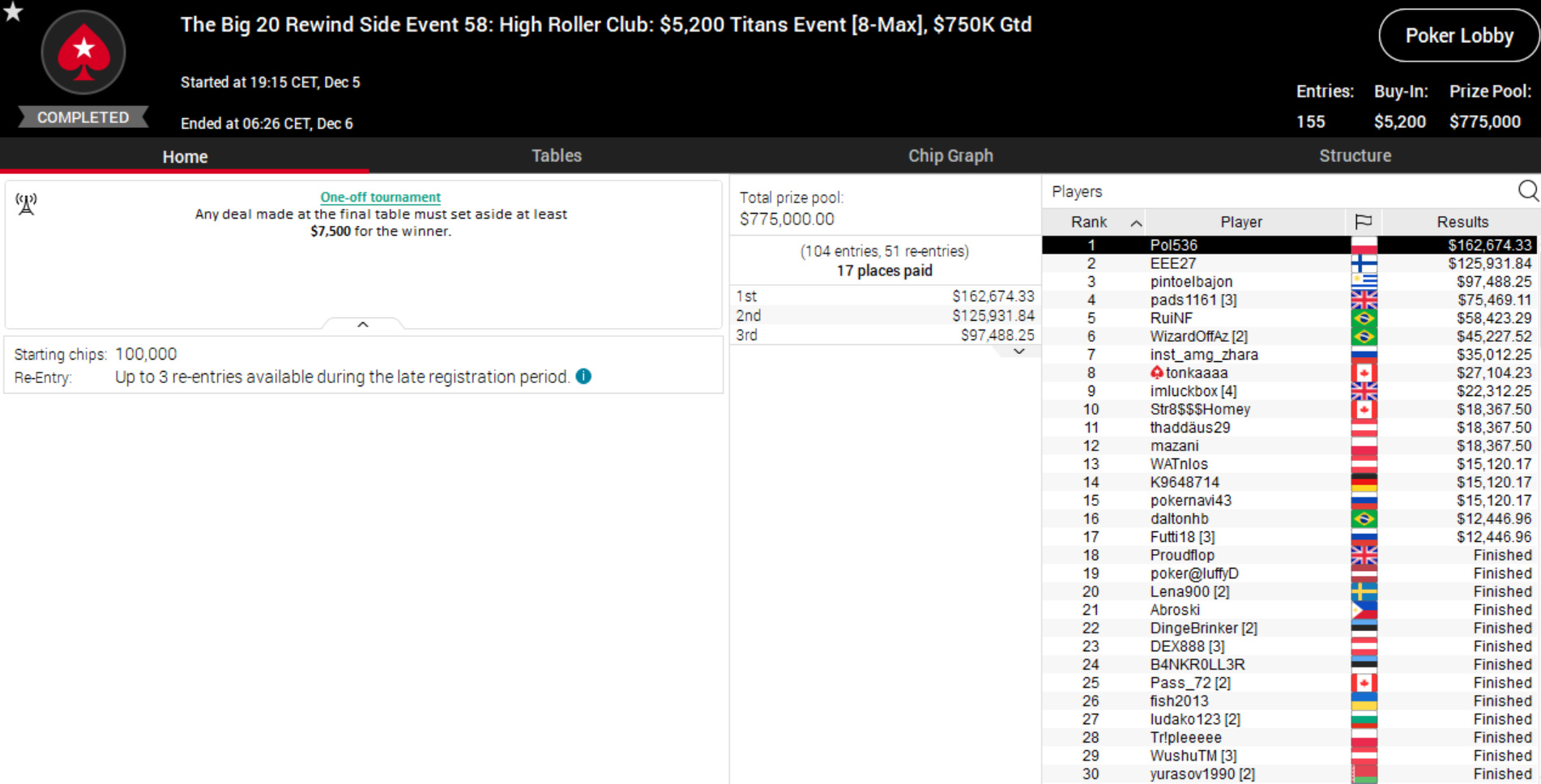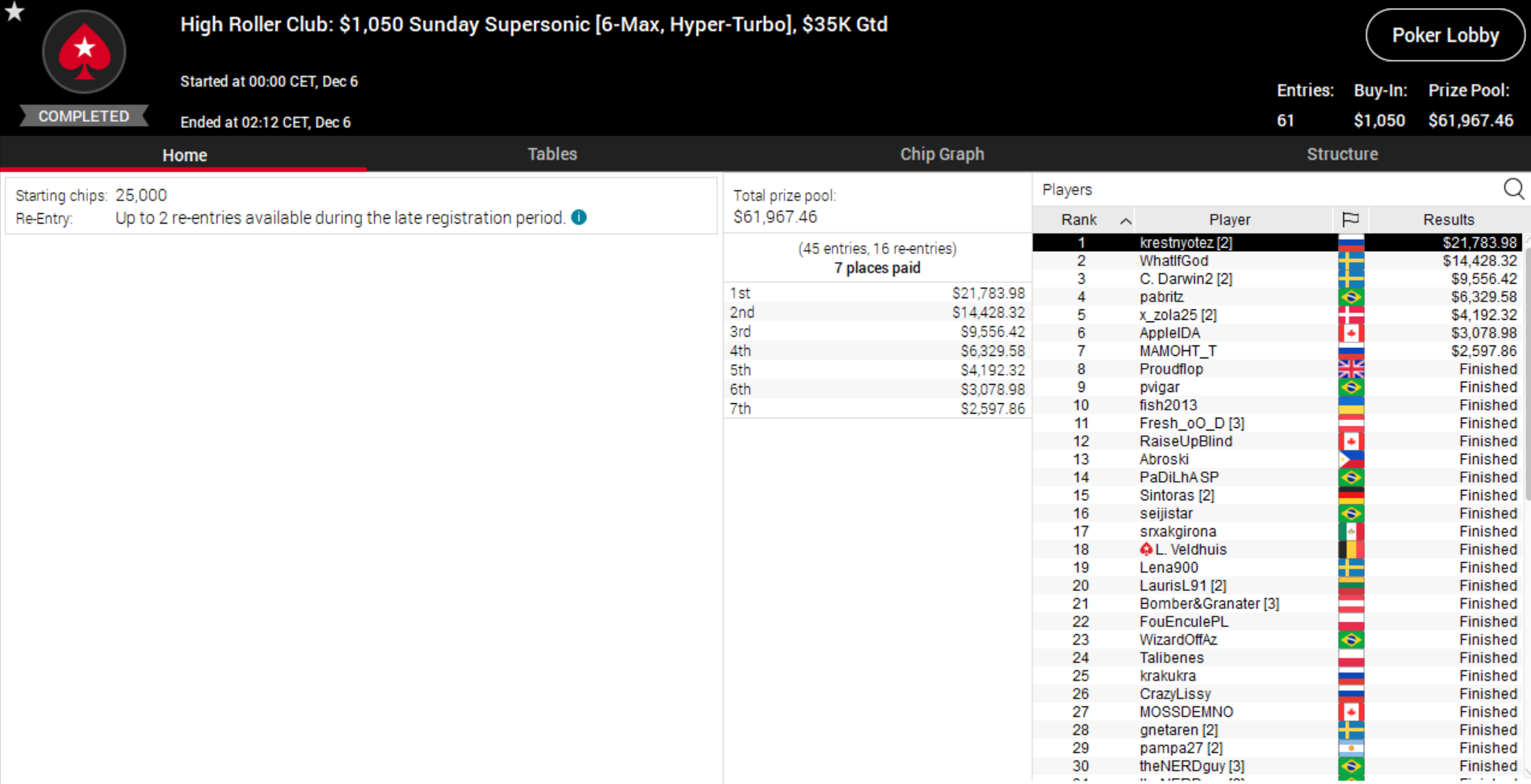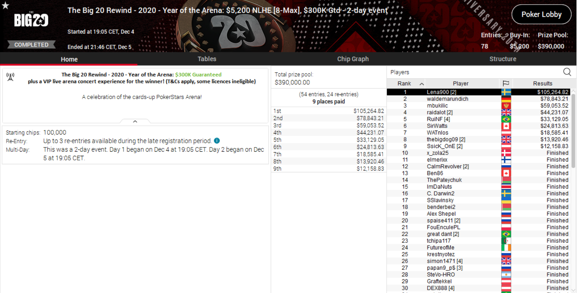 Während Segebrecht und Rudolph sich mit den Plätzen 9 und 7 begnügen mussten, spielte „waldemarundich“ lange um den Sieg mit. Am Ende musste er sich nur Niklas „Lena900“ Astedt im Heads-Up beugen und konnte sich über fast $79.000 freuen.