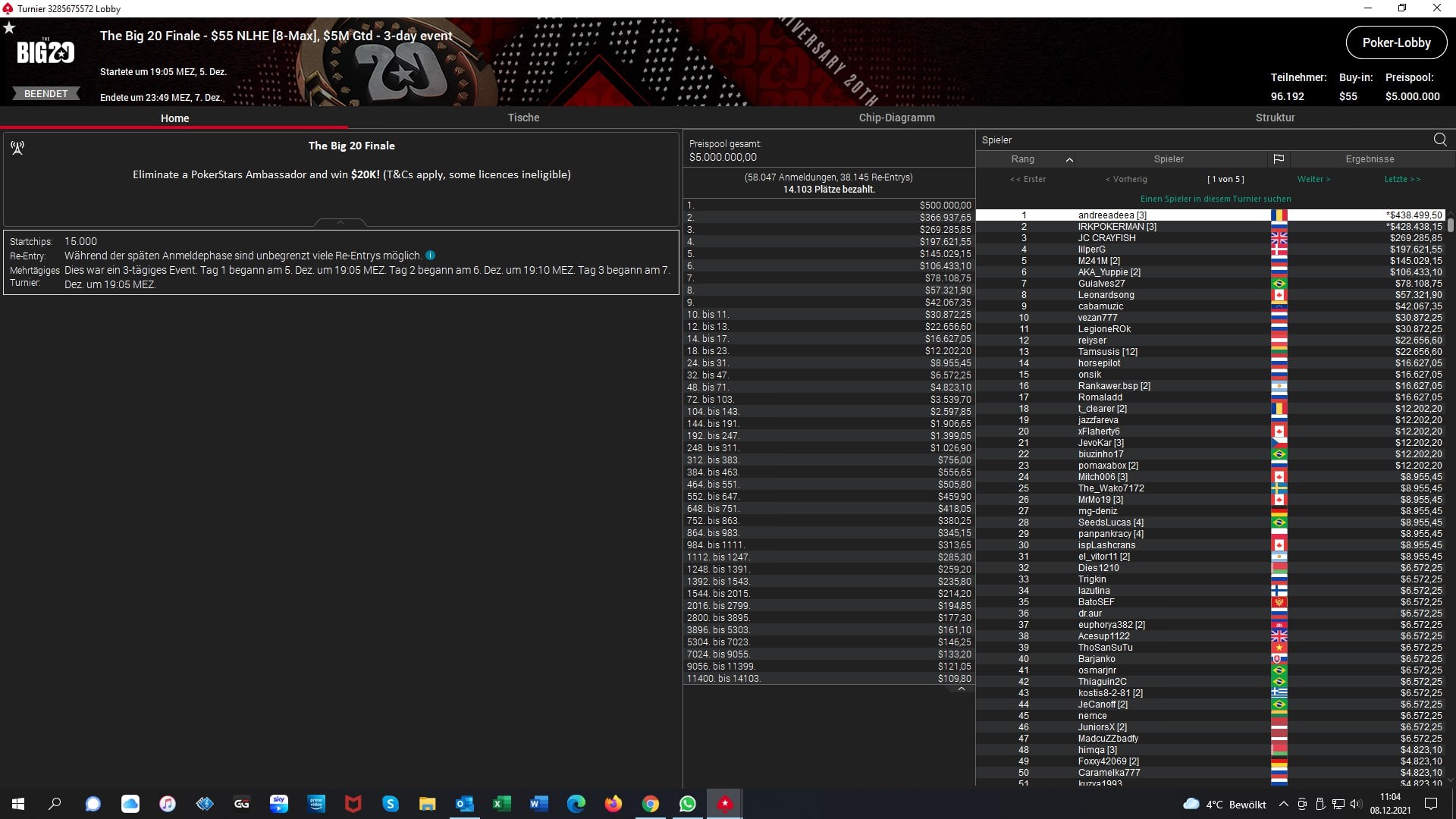 Beim $55 „The Big 20 Rewind“ Finale kamen am Dienstagabend die besten 72 von ehemals 96.192 Entries zurück an die virtuellen Tischen um den Löwenanteil des $5.000.000 großen Preispools unter sich aufzuteilen. Alle hatten schon $3.539 sicher und der Champion sollte $500.000 bekommen. Als bester DACH-Spieler belegte „reiyser“ aus Österreich Platz 12 für $22.656. Im Heads-Up einigten sich der Rumäne „andreedeea“ und der Russe „IRKPOKERMAN“ auf einen Deal und „reiyser“ holte sich den offiziellen Sieg und $438.499. „IRKPOKERMAN“ (RUS) kam als Runner-Up noch $428.438.