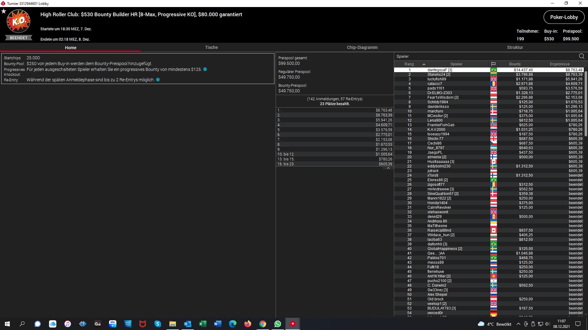 Das größte Event war mit 199 Entries und $99.500 im Preispool das $530 Bounty Builder High Roller. Hier triumphierte „dantegoyaF“ aus Brasilien und räumte $8.763 + $14.437 Bounties ab. Bester DACH-Grinder wurde „Dr.ELMO-2303“ (AUT) auf Platz 6 für $2.775 + $1.328 Bounties.