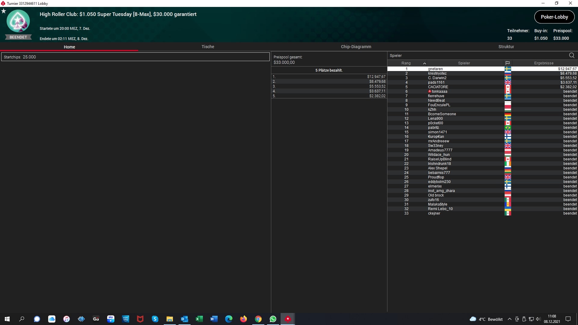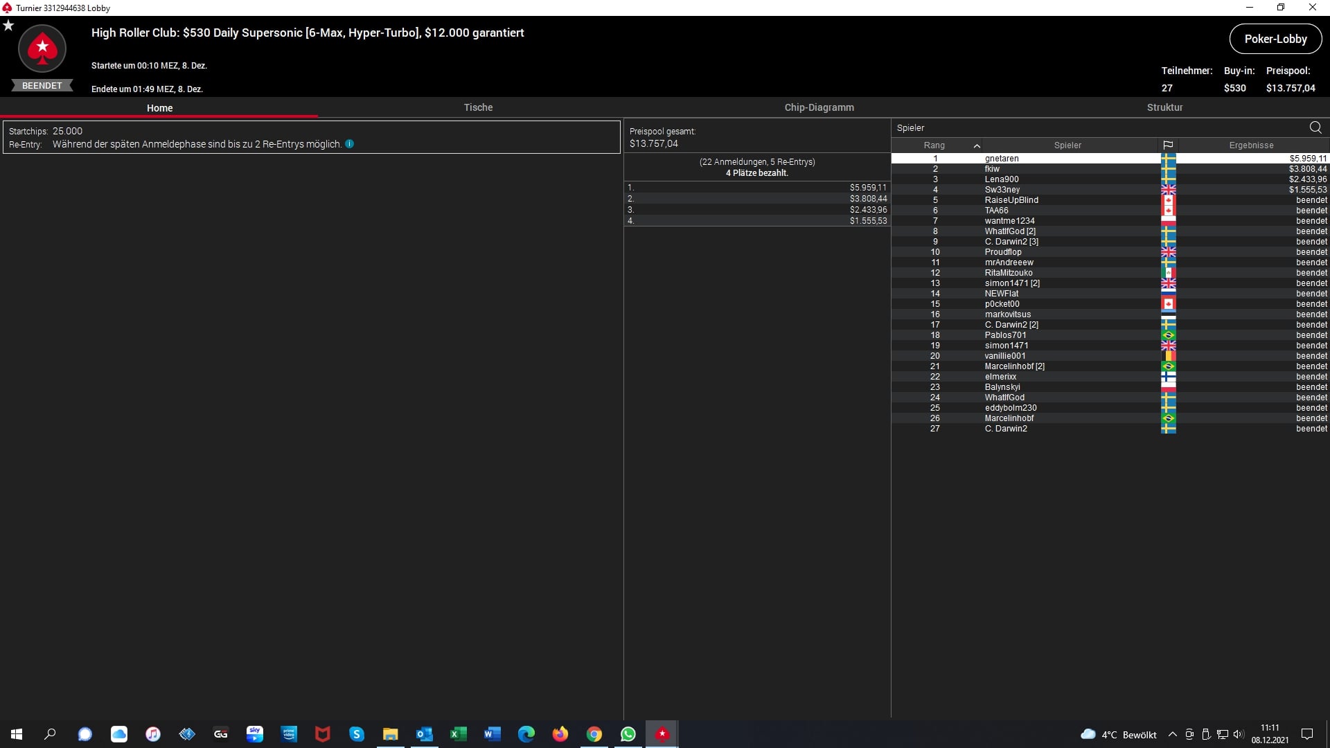 Es war der Tag der schwedischen Online-Grinder im PokerStars High Roller Club. Von 18 Podestplätzen gingen gleich acht an schwedische Online-Grinder. Besonders „gnetoren“ (SWE) fiel hier auf. Er holte sich den Sieg und $12.947 beim $1.050 Super Tuesday und gewann wenig später noch für $5.959 das $530 Daily Supersonic Event.