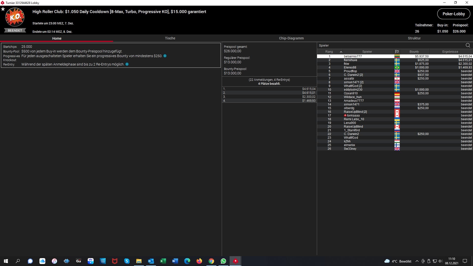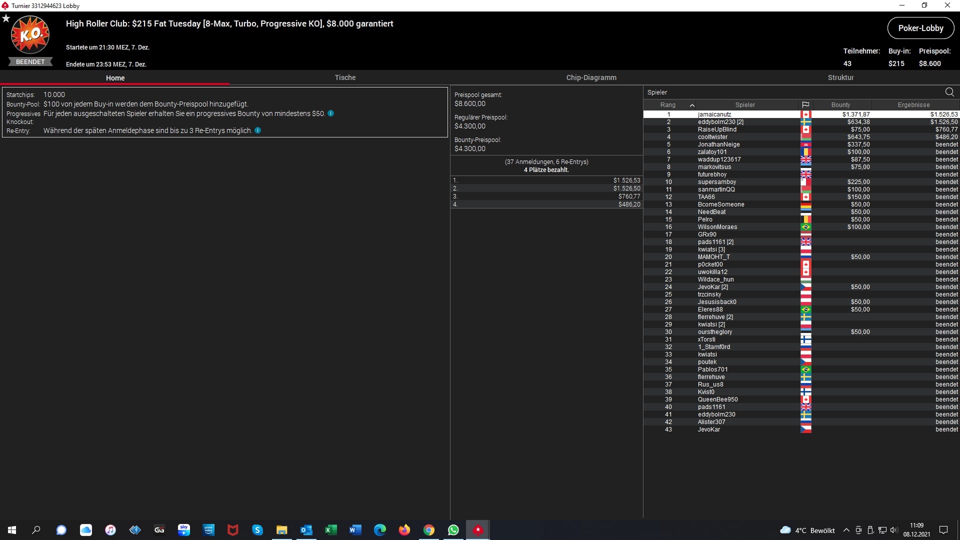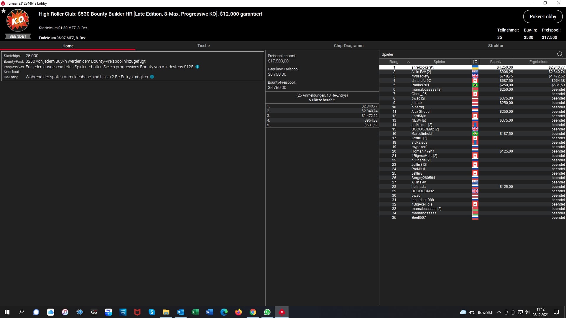Dann gab es noch Siege für „jamaicanutz“ (CAN – $1.526 + $1.371 Bounties) beim $215 Fat Tuesday, „bebaimis777“ (LTU – $4.615 + $5.937 Bounties) beim $1.050 Daily Cooldown und für „shrekpoker91“ (UKR – $2.840 + $4.250 Bounties) beim $530 Bounty Builder High Roller Late-Edition Event.