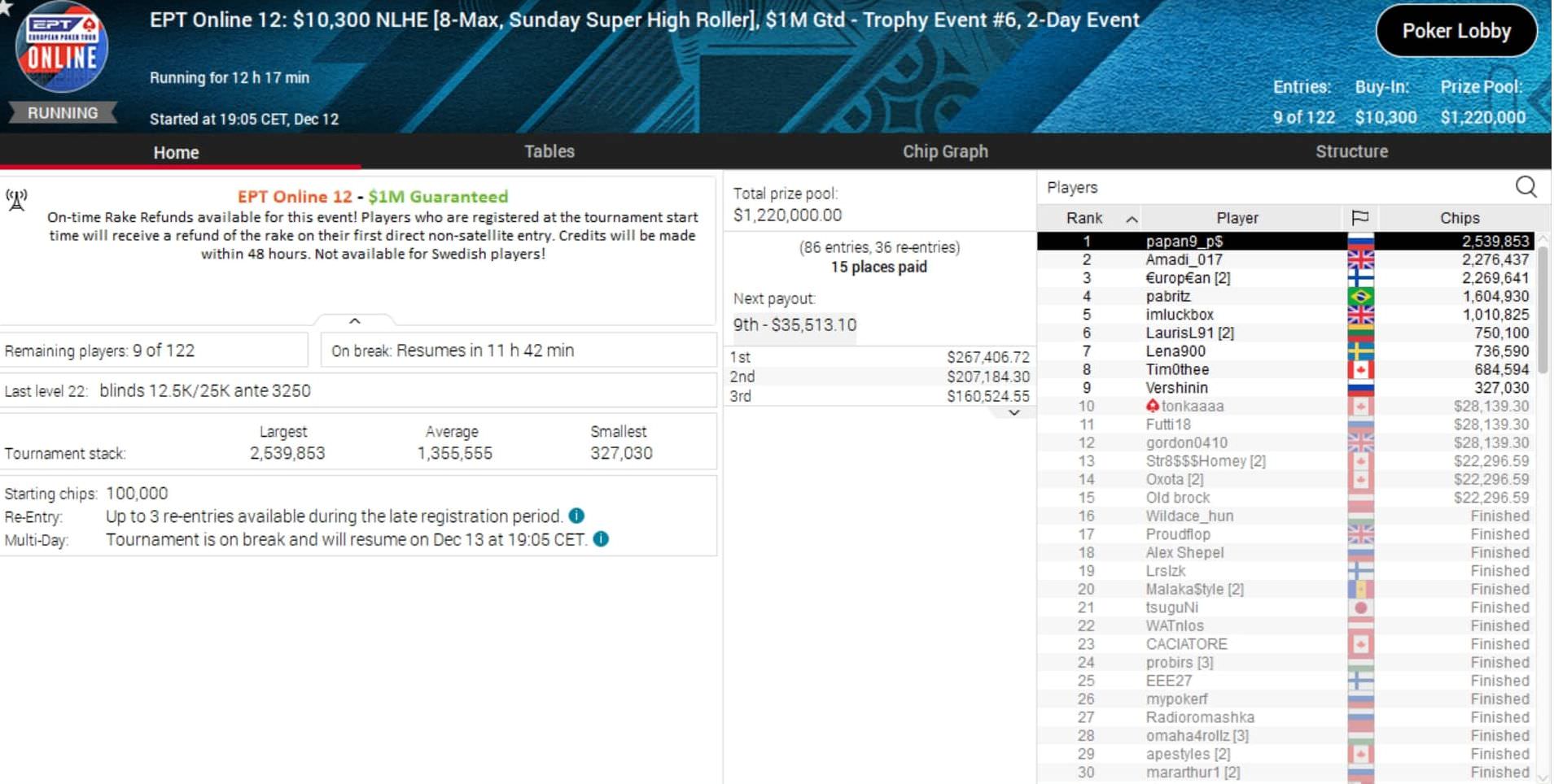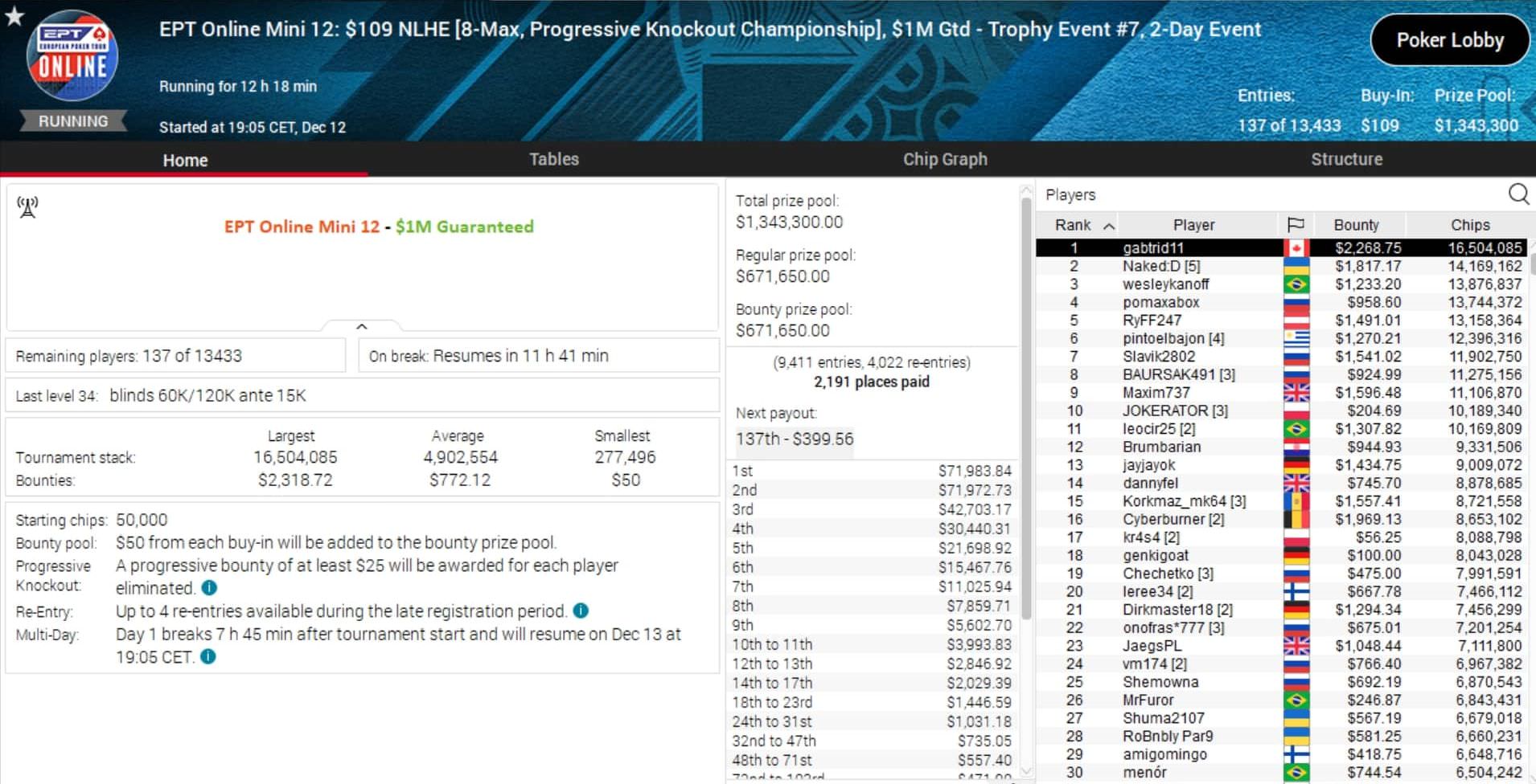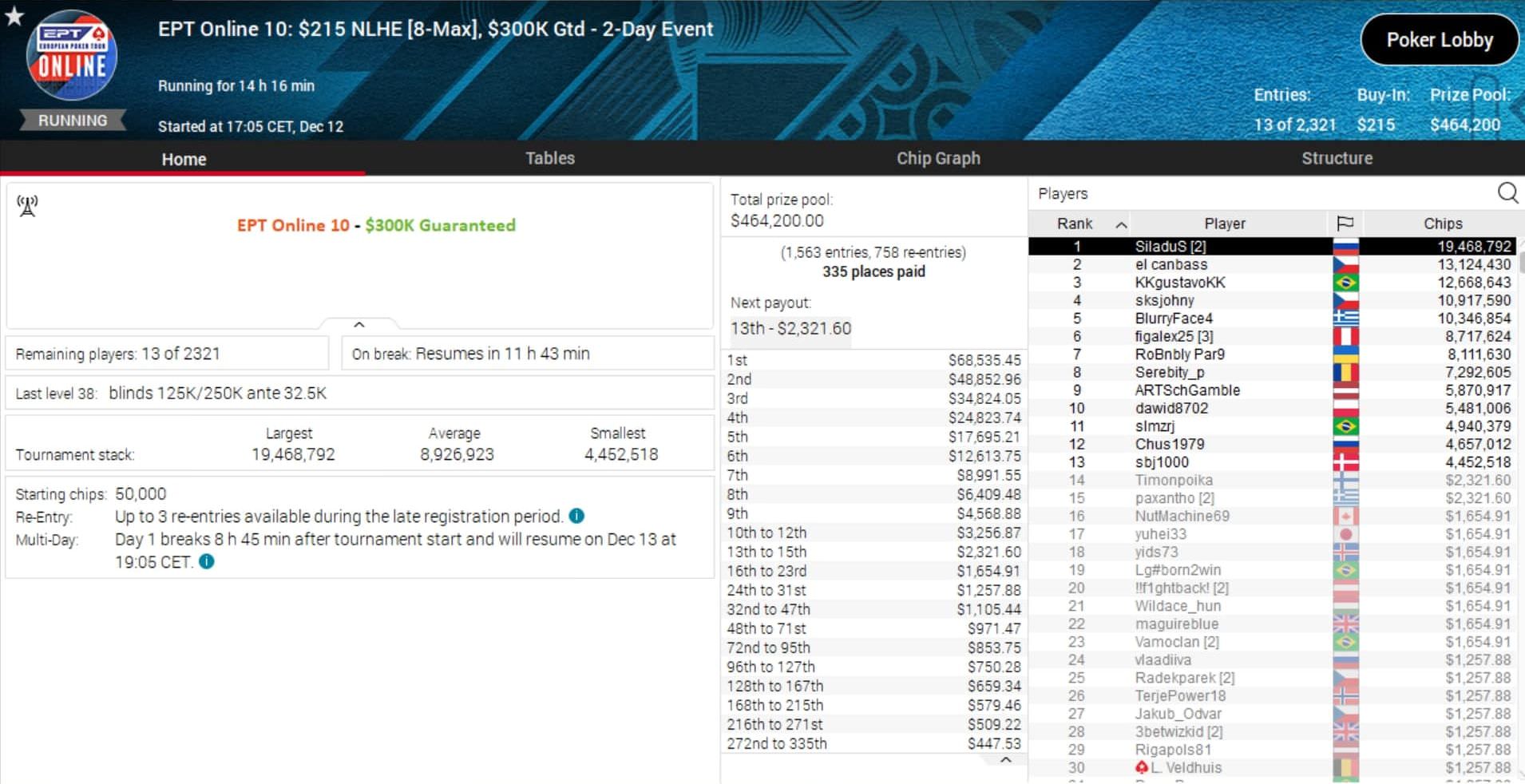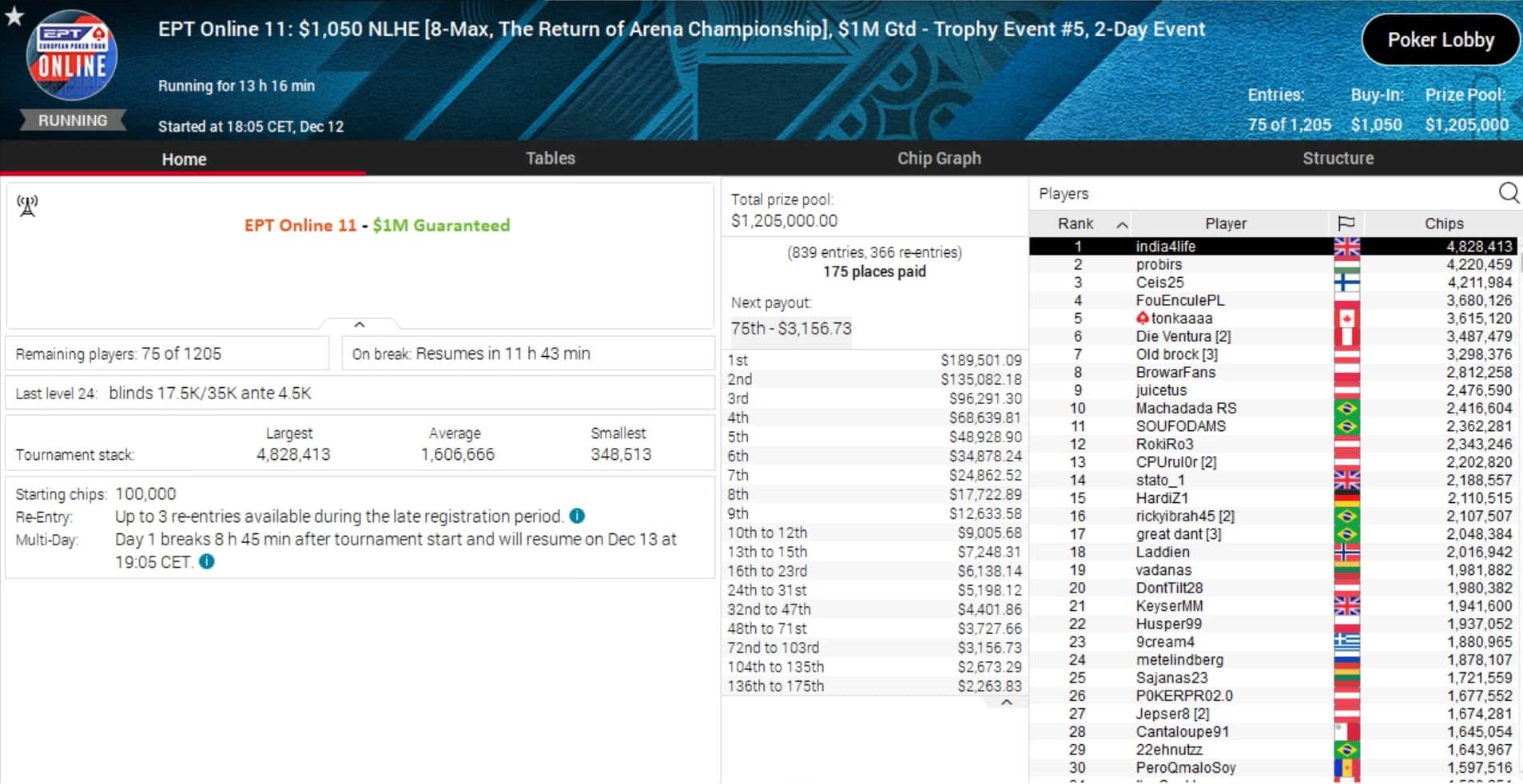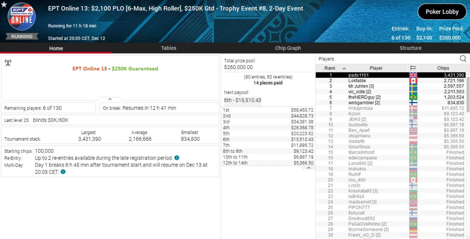 Dagegen mischen bei Event 11, einem $1.050 NLHE, noch etliche DACH-Spieler mit, wenn es heute in die Entscheidung geht. Auf Platz 7 liegt „old brock“, auf Platz 9 „juicetus“ und auf Platz 12 „RokiRo“.