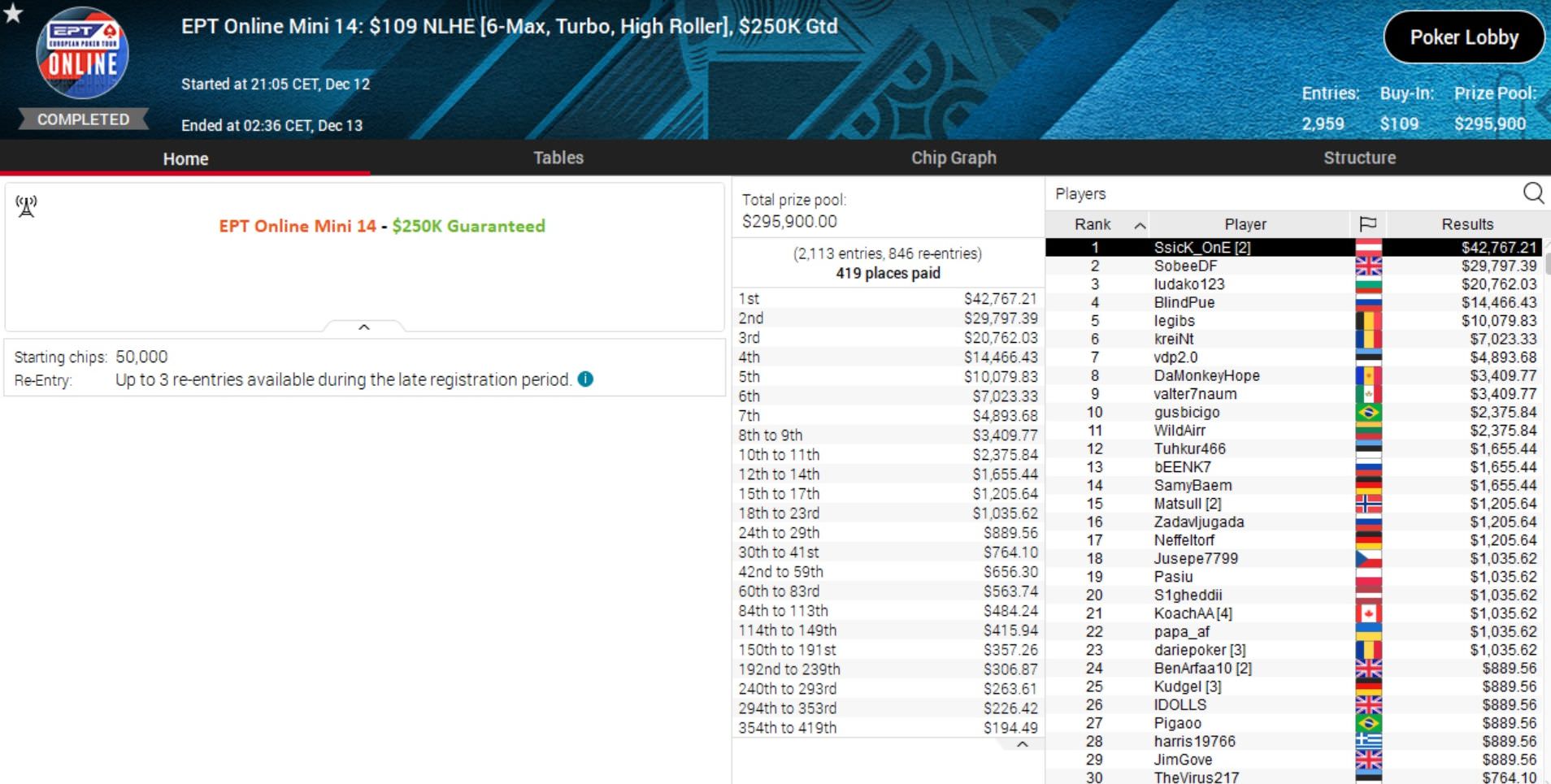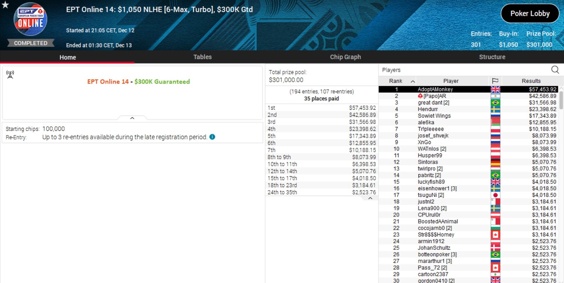 Der in Österreich lebende Deutsche setzte sich bei Event 14 der EPT Online, einem $109 NLHE, gegen 2.958 Konkurrenten durch und räumte rund $42.800 ab.