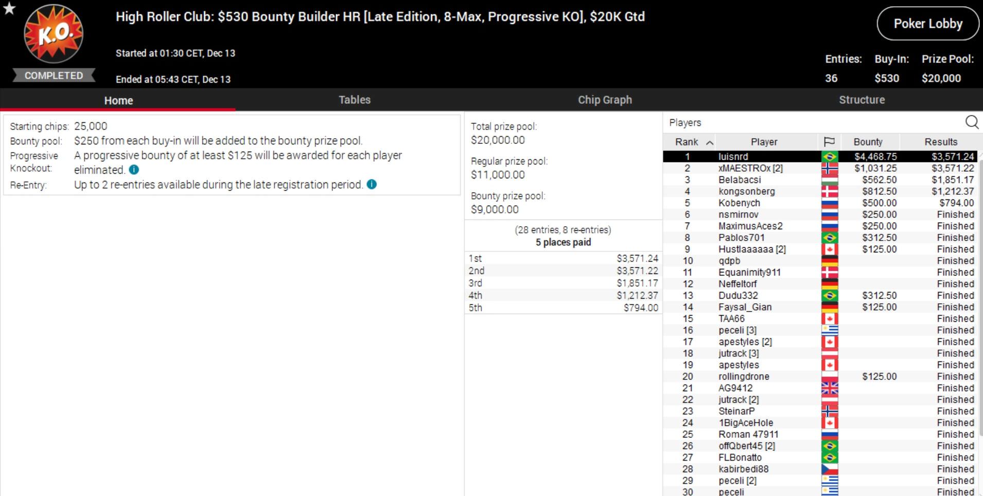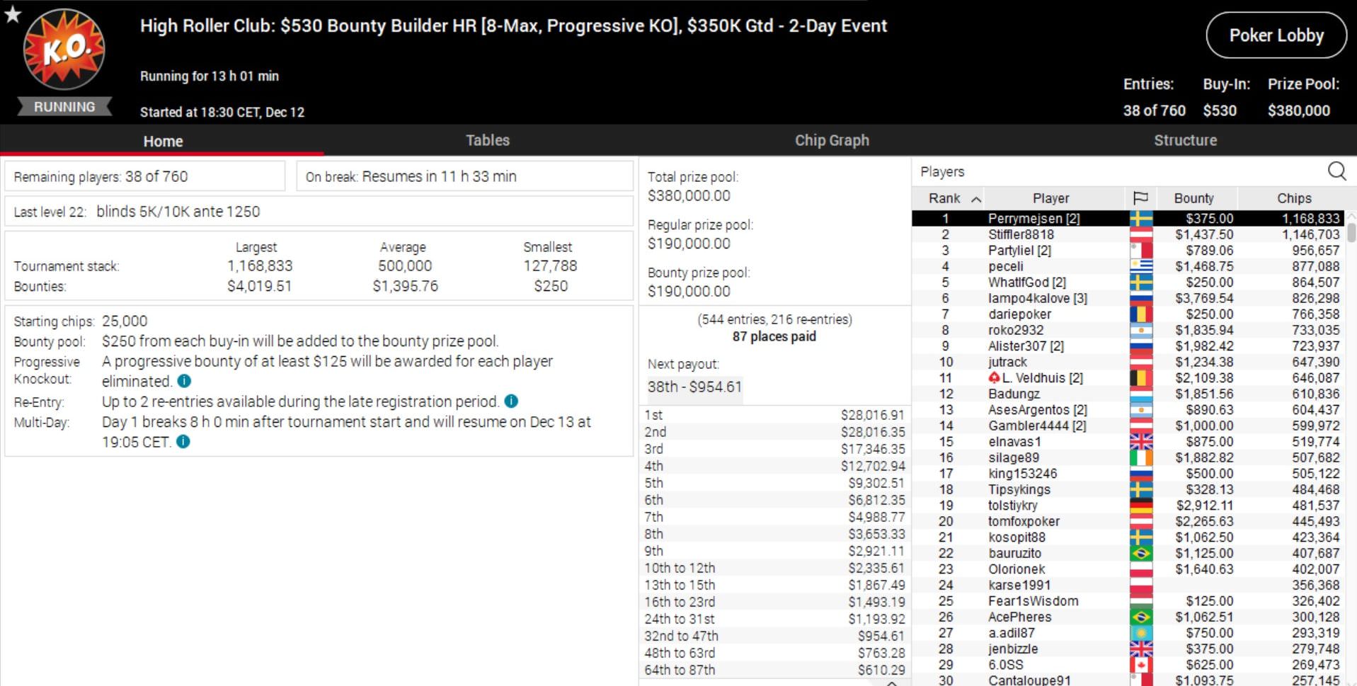 Vertagt wurde wie üblich die Entscheidung beim $530 Bounty Builder. Unter den 38 Finalisten sind auch einige DACH-Spieler dabei, die besten Chancen hat dabei „Stiffler8818“ als Zweiter nach Tag 1.