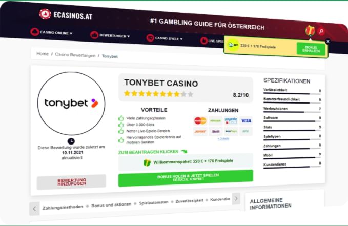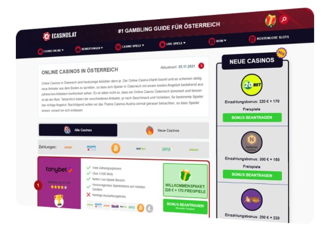 Auf der Hauptseite finden Sie zunächst einen Artikel, der erklärt, wie das Glücksspiel in Österreich im Allgemeinen funktioniert und ob es hier legal ist. Außerdem finden Sie im oberen Menü und in der Fußzeile Links zu Seiten, auf denen Sie mehr über bestimmte Zahlungsdienste, die von österreichischen Casinos akzeptiert werden, über Casinospiele, einschließlich Live-Spiele und kostenlose Spielautomaten, und eine ganze Reihe von Informationen über Boni lesen können.