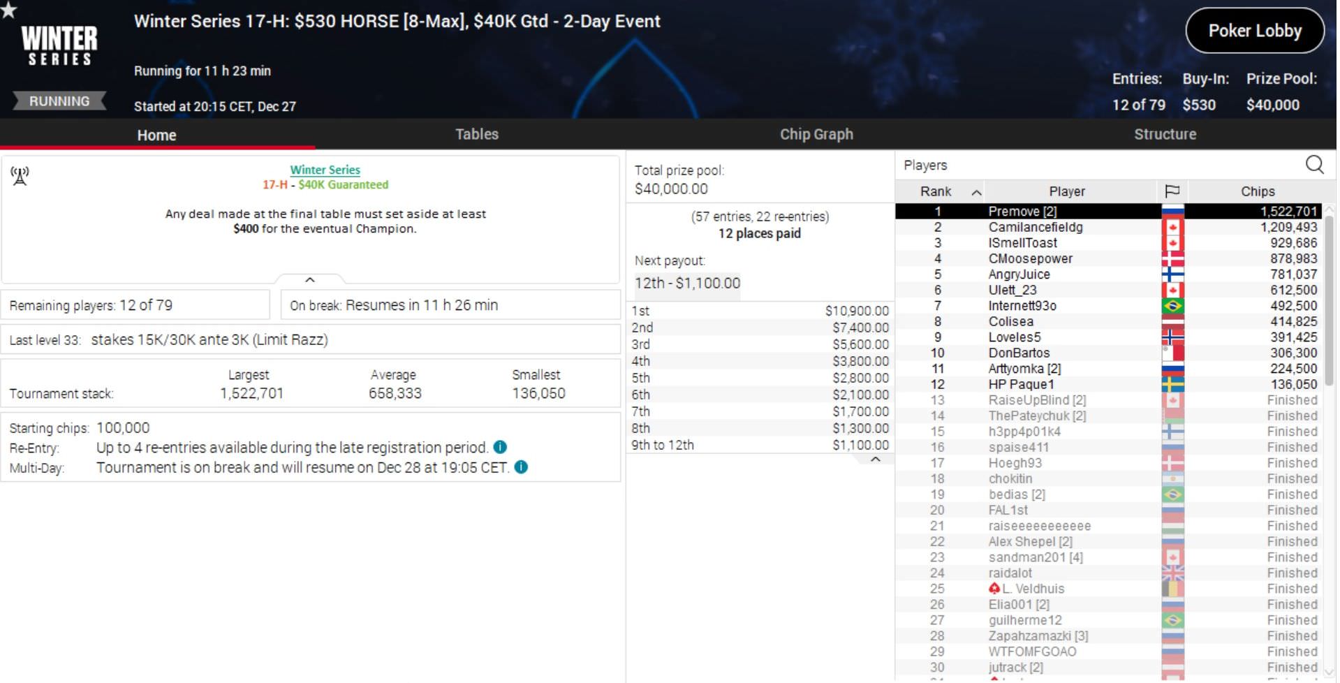 Hier die End- und Zwischenstände der Turniere der Winter Series und des High Roller Clubs: