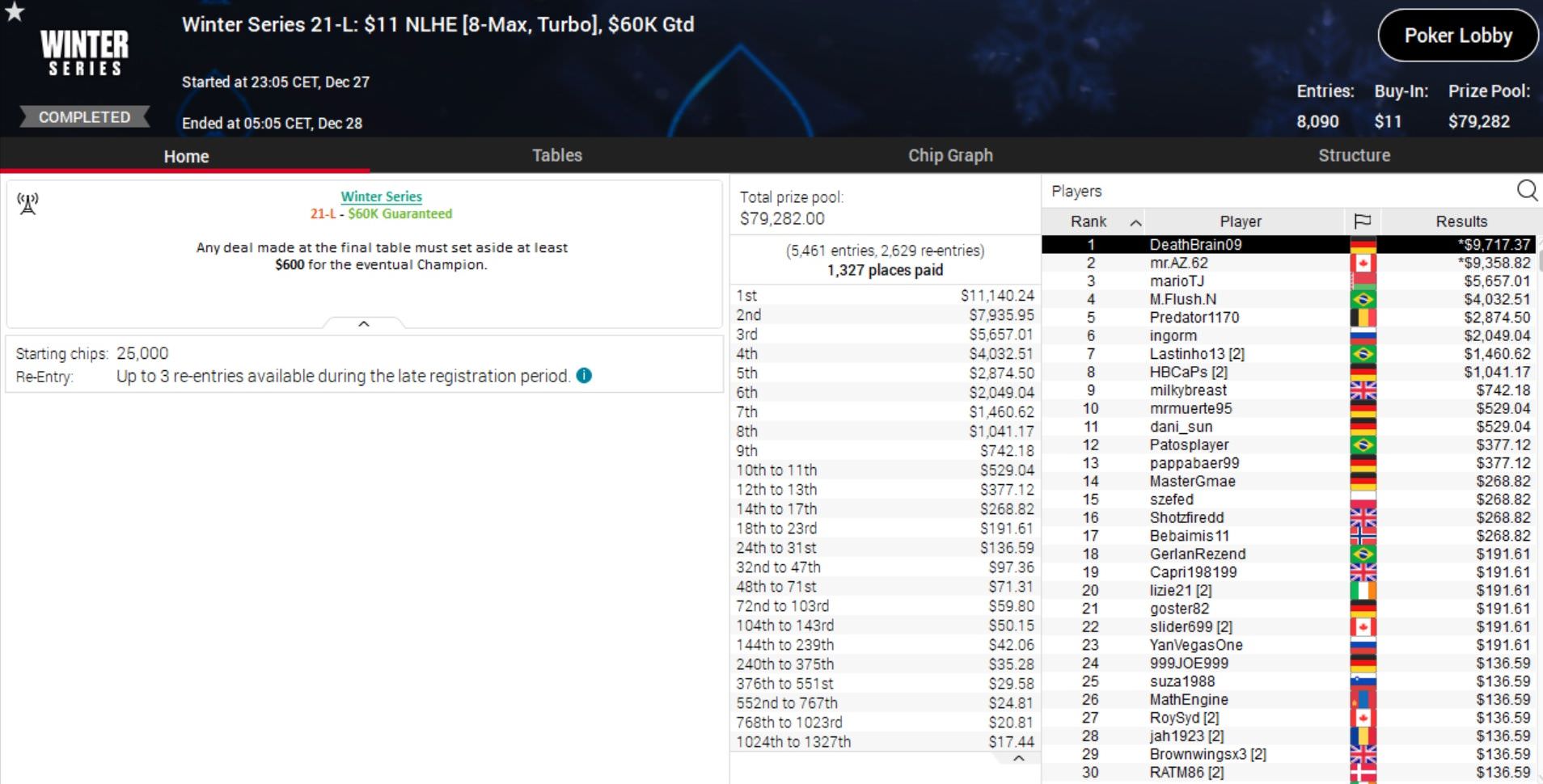 Den zweiten DACH-Sieg des Tages holte „DeathBrain09“ bei Event 21-L, einem $11 NLHE Turbo. Er ließ über 8.000 Spieler hinter sich und kassierte nach einem Deal mit dem Zweitplatzierten gut $9.000 Preisgeld.