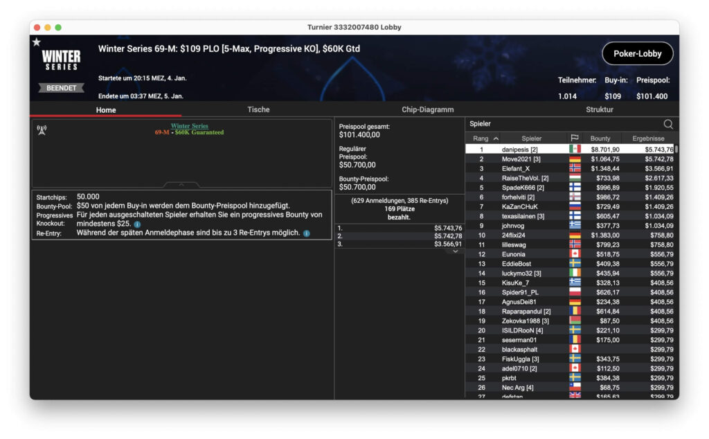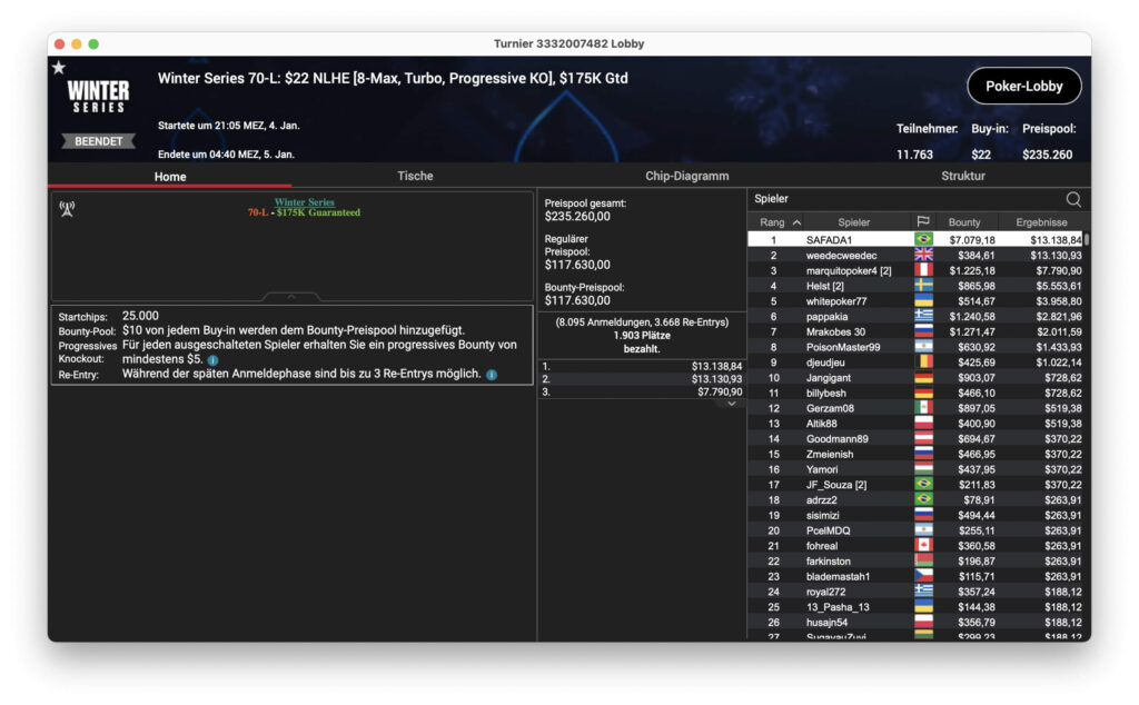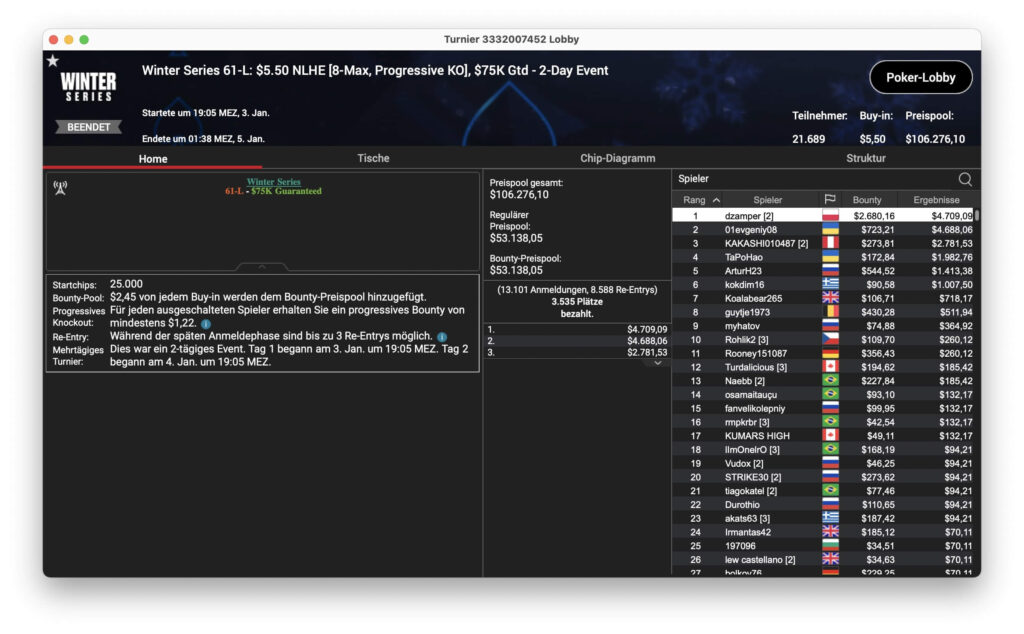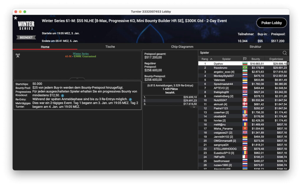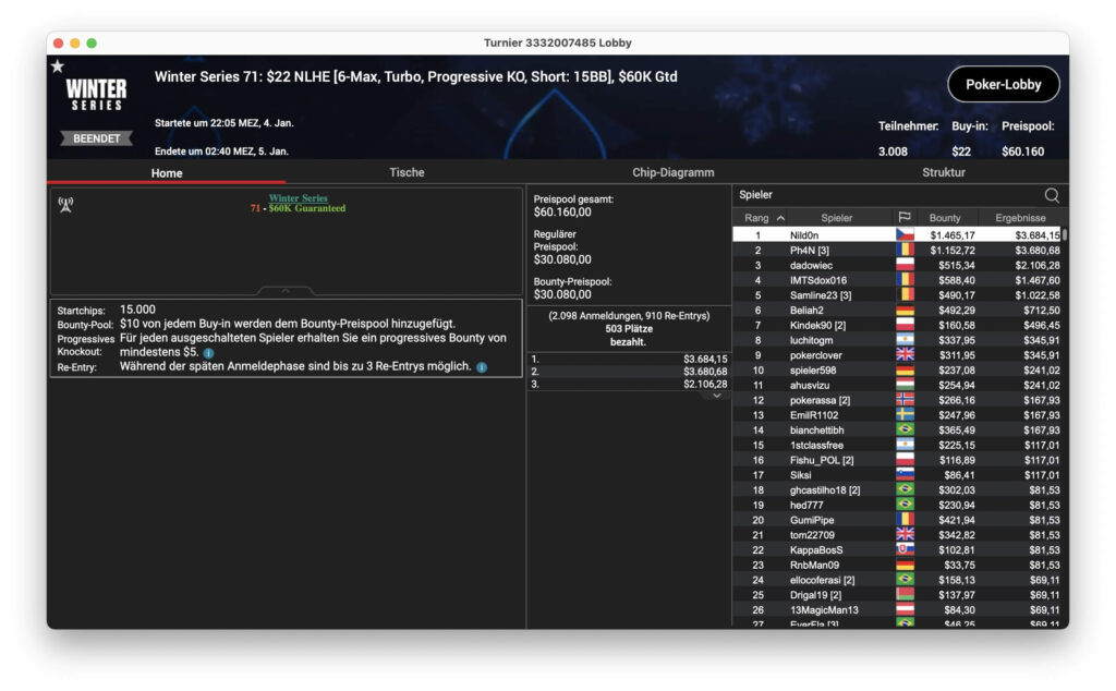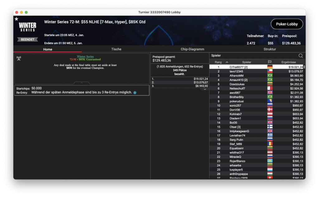 Bei zwei weiteren Winter Series Events mit kleineren Buy-Ins konnten ebenfalls deutsche Spieler gewinnen: „CiTral6077“ holte den Titel bei Event 72-M, einem $55 NLHE 7-Max Hyper mit 2.472 Entries. Für den Sieg gab es beachtliche $19.021.