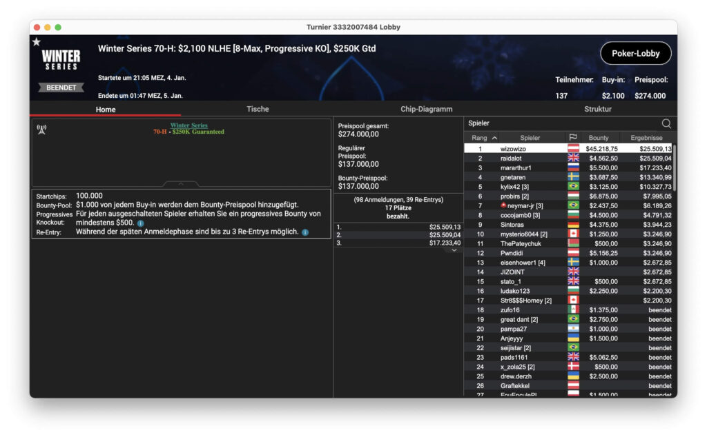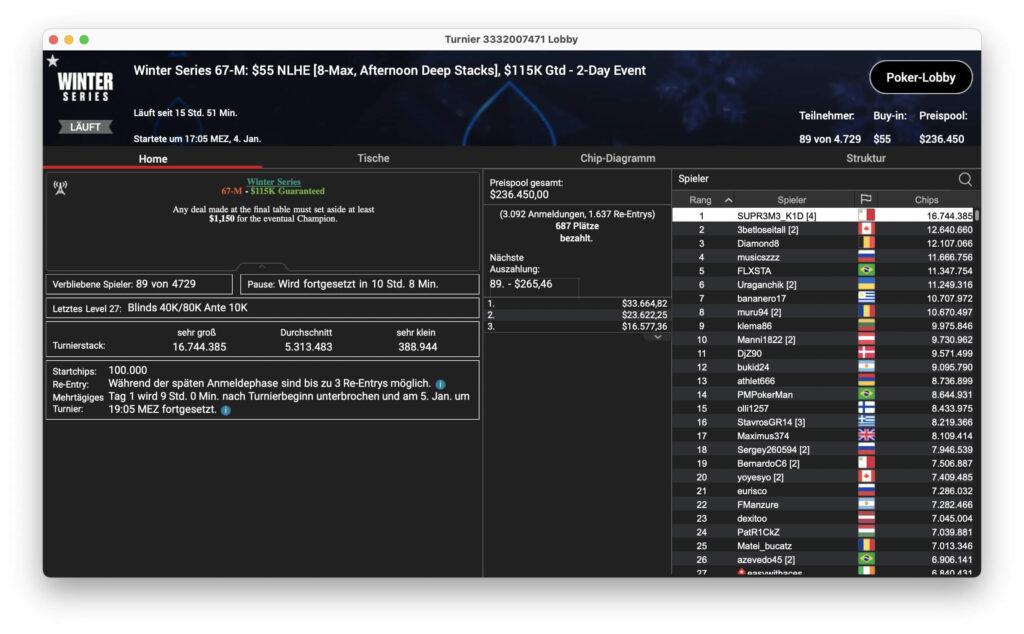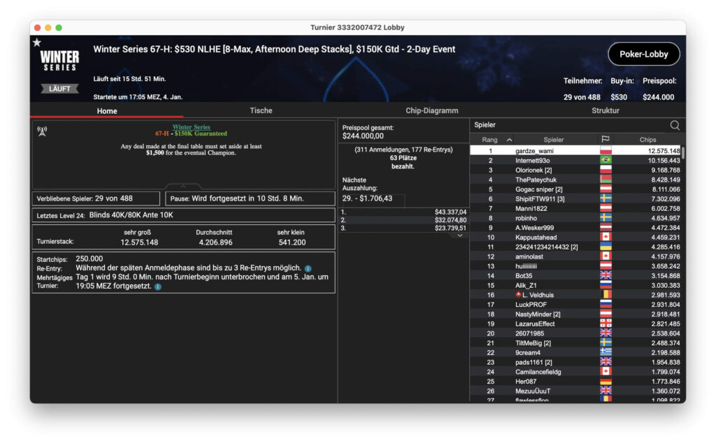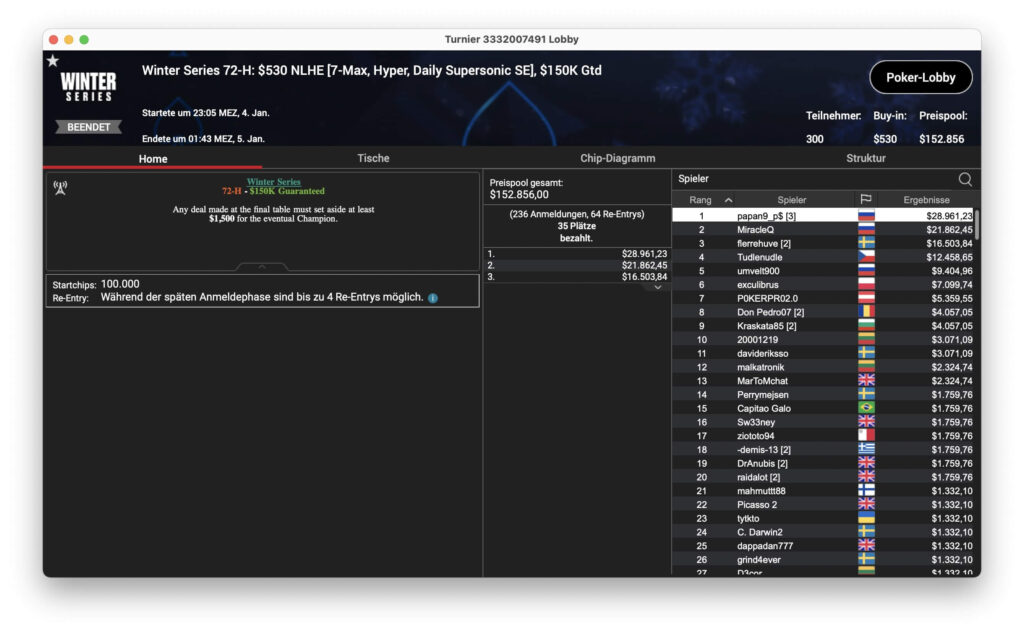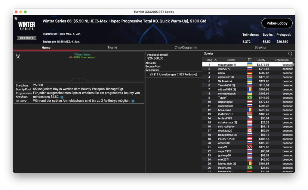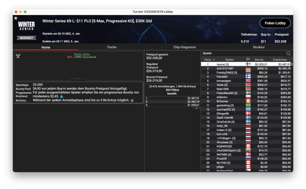 Bei zwei weiteren Winter Series Events mit kleineren Buy-Ins konnten ebenfalls deutsche Spieler gewinnen: „CiTral6077“ holte den Titel bei Event 72-M, einem $55 NLHE 7-Max Hyper mit 2.472 Entries. Für den Sieg gab es beachtliche $19.021.