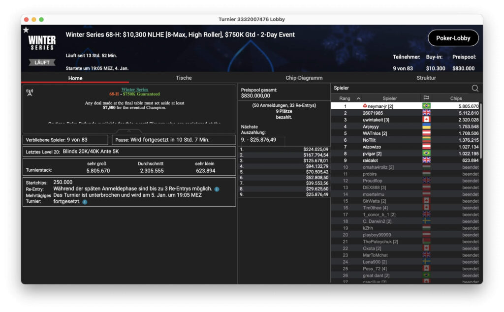 Beim teuersten Turnier des Tages dem $10.300 High Roller mit 83 Entries und $830.000 Preispool sind noch 9 Spieler der Starter übrig. PokerStars-Repräsentant und Fußball-Profi Neymar jr. führt das Feld mit 5,8 Mio. Chips and. Unter den deutschsprachigen Spielern sind Christian „WATnlos“ Rudolph (1,7 Mio. Chips) und Ole „wizowizo“ Schemion (1 Mio. Chips) noch mit im Rennnen. Auf den Sieger warten $224.025.