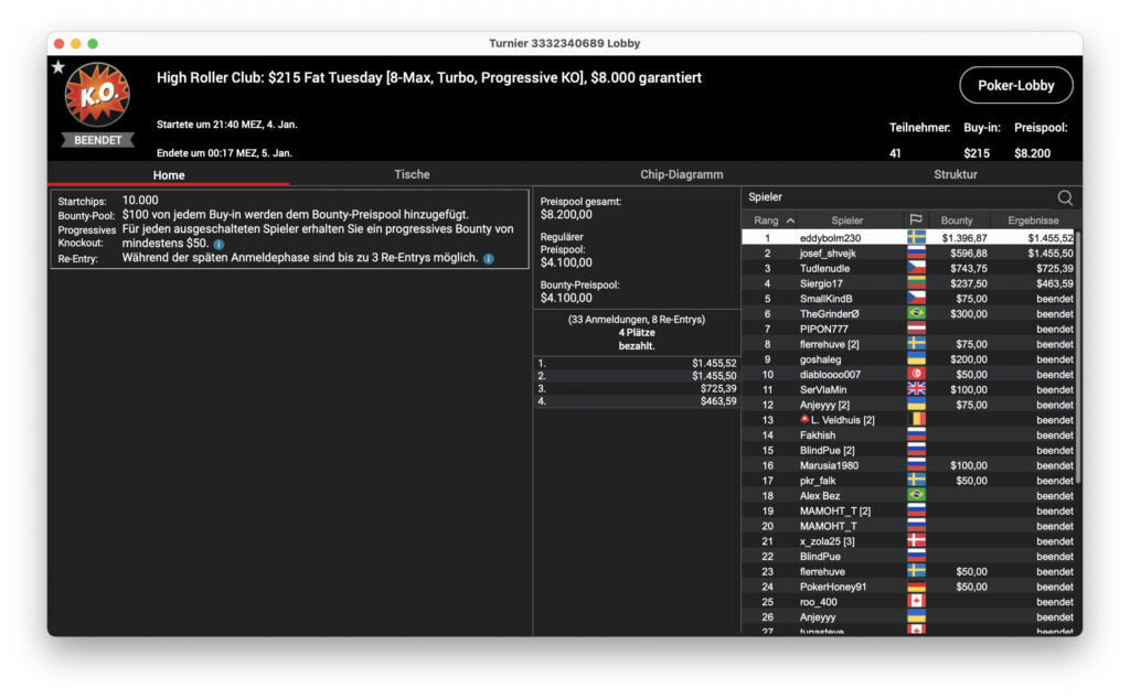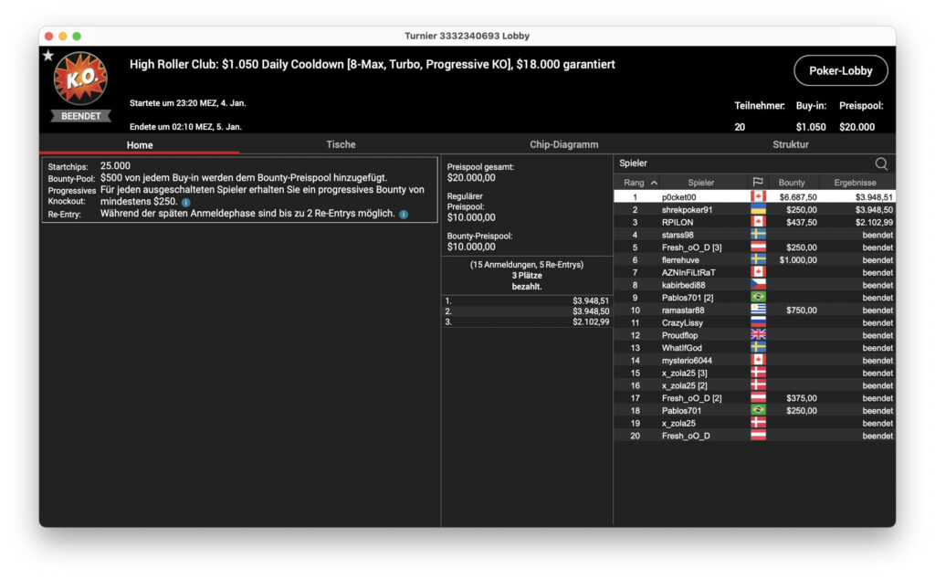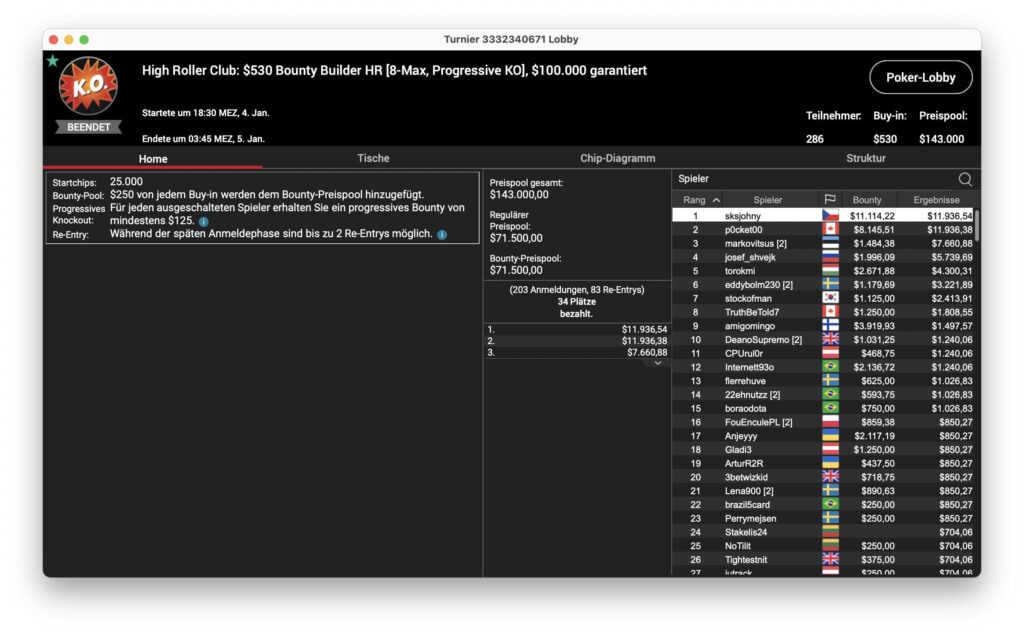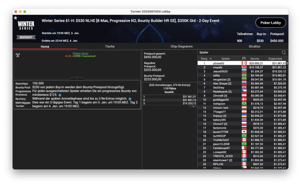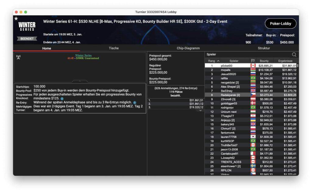 Im High Roller Club gab es keine DACH-Erfolge. Der Profi Sebastian „p0cket00“ Sikorski aber räumte kräftig ab. Er gewann das $1.050 Daily Cooldown für $6.687 + $3.948 dort und ein großes Turnier bei der Winter Series. Event 61-H, $530 NLHE Bounty Builder mit 900 Entries und $450.000 Preispool, ging ebenfalls an den Kanadier – $25.695 + $31.861 gab es dafür.