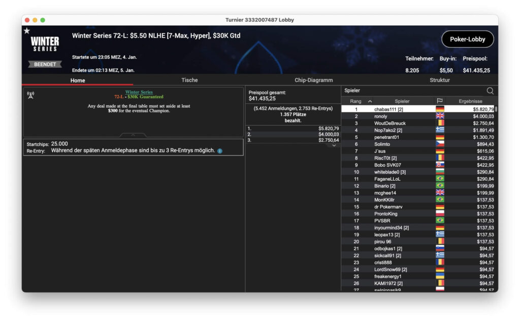 Landsmann „chabas111“ holte sich 72-L, ein $5,50 NLHE 7-Max Hyper, für $5.820. Er setzte sich mit seiner zweiten Bullet gegen 8.203 gegnerische Entries durch.