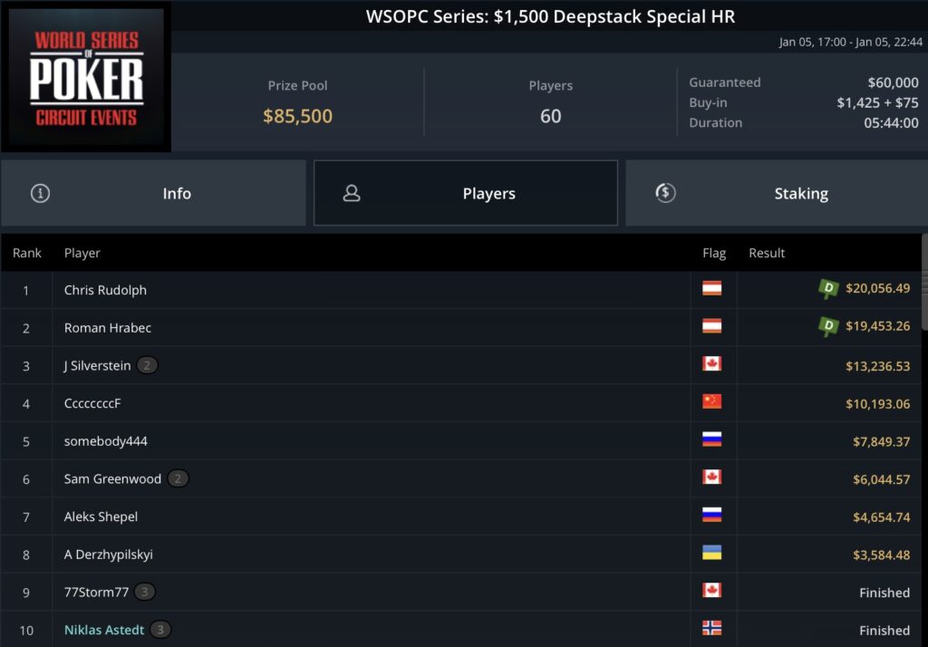 Christian Rudolph konnte sich nach einem Deal mit Roman Hrabec das $1.500 Deepstack Special HR schnappen. Rudolph gewann dort $20.056.
