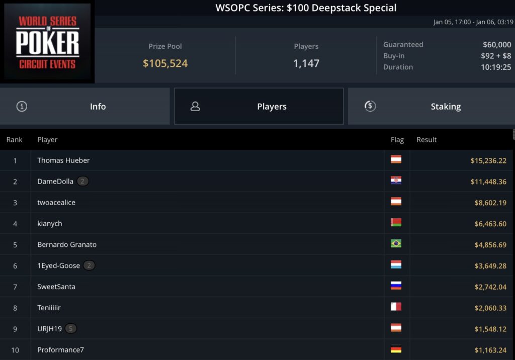 1.147 Entries traten beim $100 Deepstack Special an, das am Ende Thomas Hueber für sich entschied. Er ging mit $15.236 aus dem Turnier. Niklas Astedt schnappte sich das $500 Fifty Stack HR mit 67 Entries und $31.825 Preispool. $7.515 sah das Turnier für den Sieger vor.