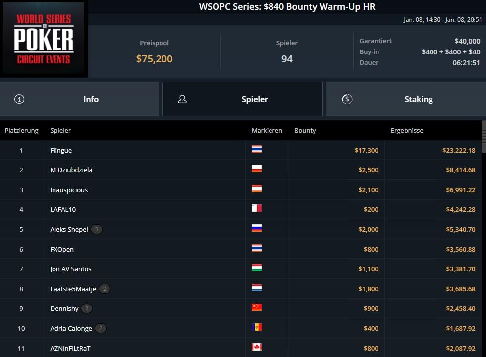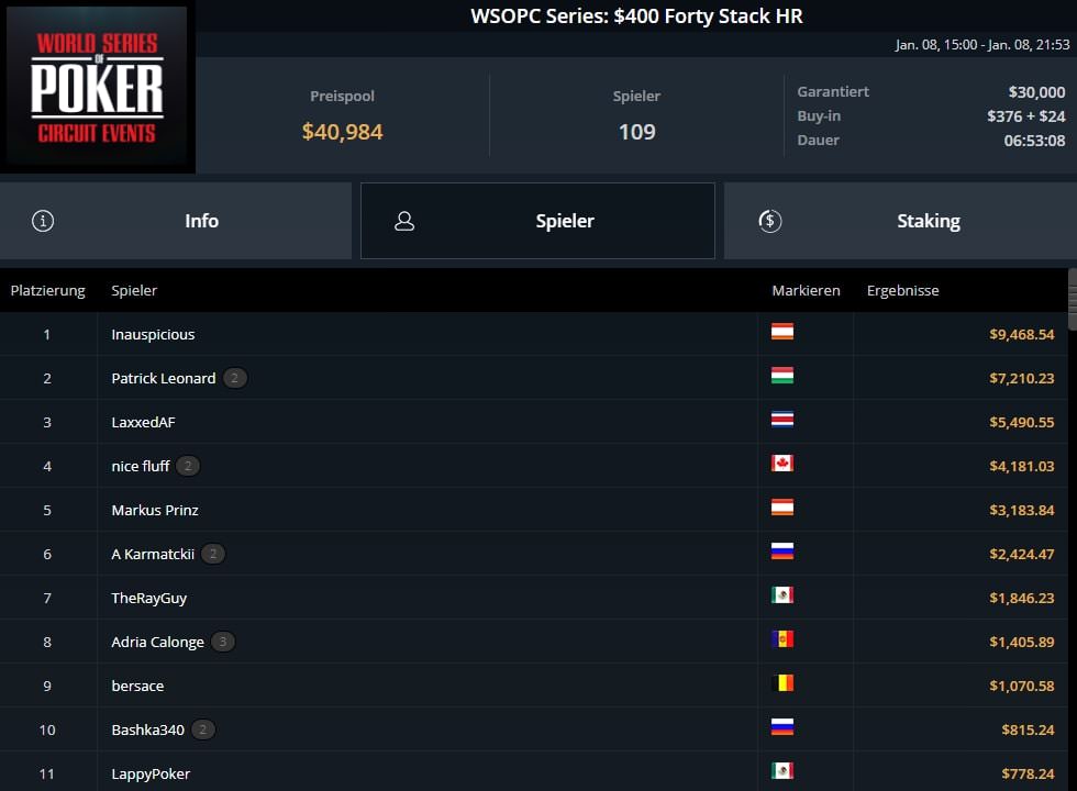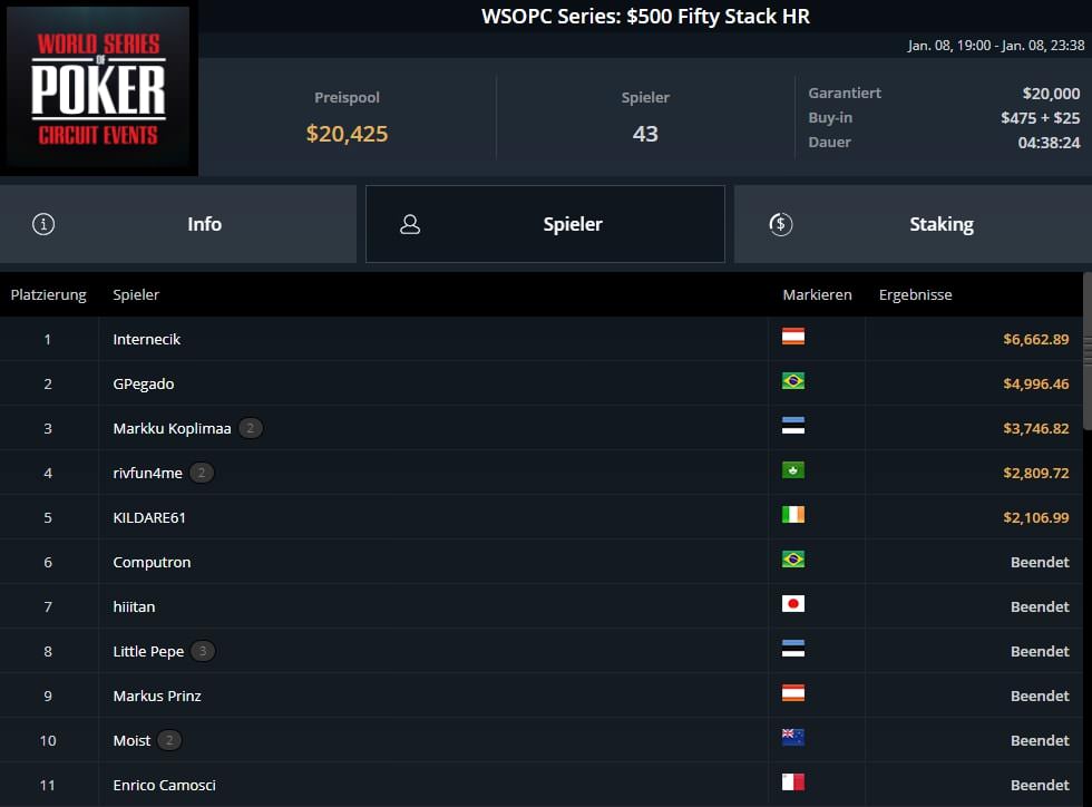 Einen weiteren Titel schnappte sich „Internecik“ (AUT). Er gewann das $500 WSOPC Fifty Stack für $6.662.