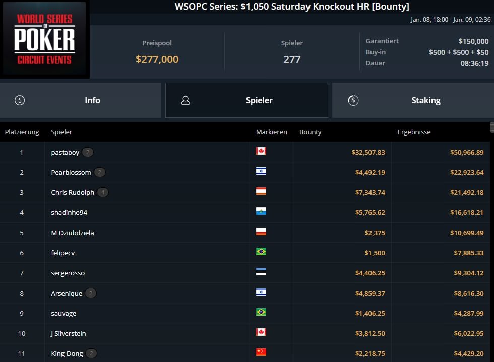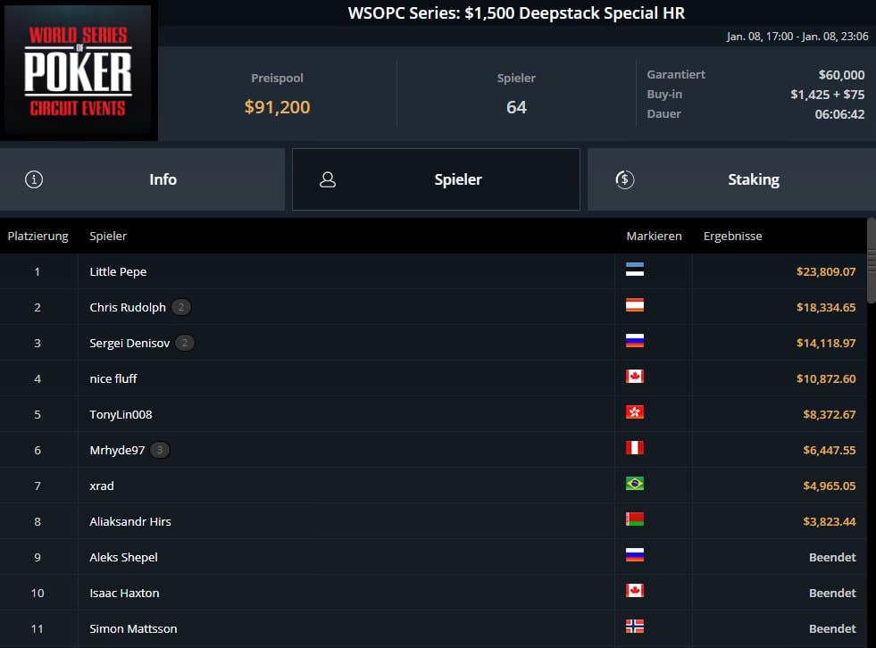 Wieder einmal war hier der Deutsche Christian Rudolph der erfolgreichste DACH-Spieler. Er wurde Runner-Up beim $1.500 WSOPC Deepstack Special High Roller für $18.334 und belegte wenig später noch Platz 3 für $21.492 inkl. $7.343 Bounties beim $1.050 WSOPC Saturday Knockout High Roller.