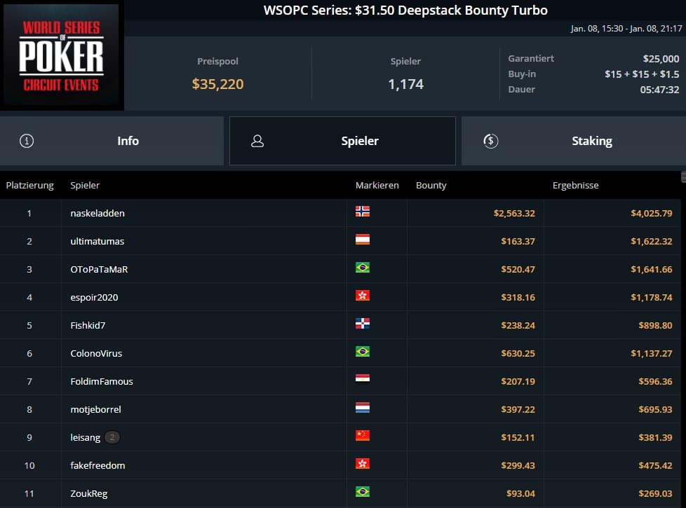 Platz 2 – $31,50 WSOPC Deepstack Bounty Turbo – „ultimatumas“ (AUT) – $1.622 inkl. $163 Bounties