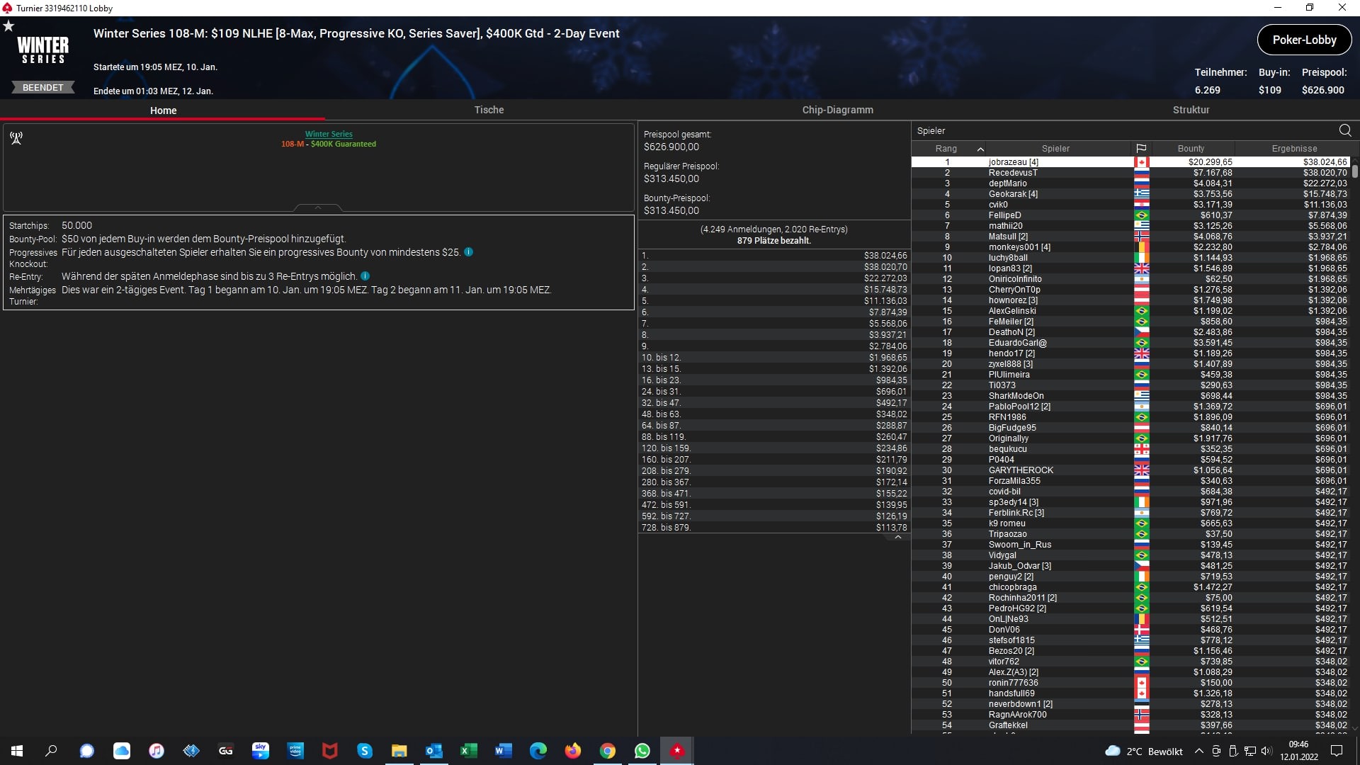 | Wed, 12 Jan | 14:15 | Event #121-M $109 6+ Hold’em [8-Max,][Turbo], $35K Gtd |