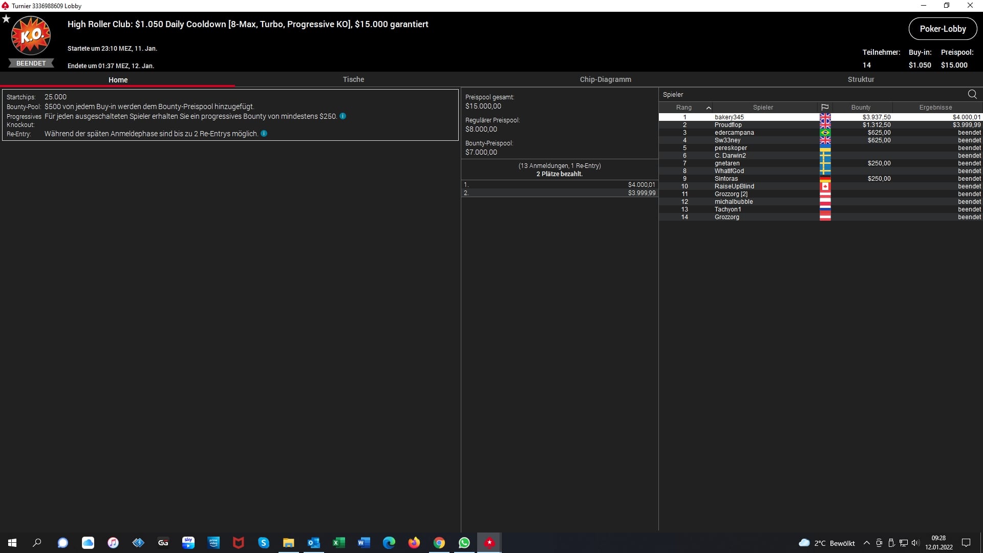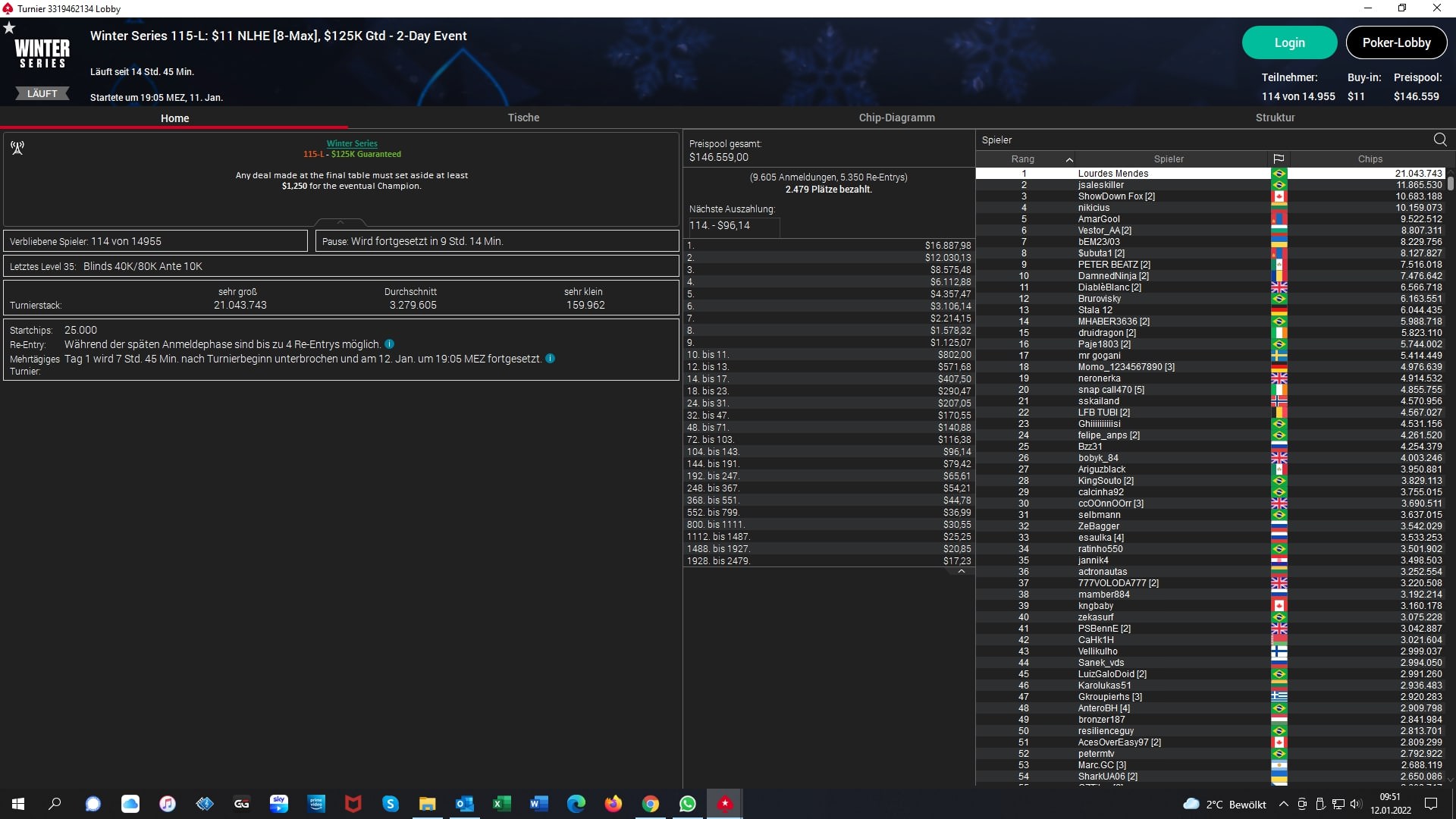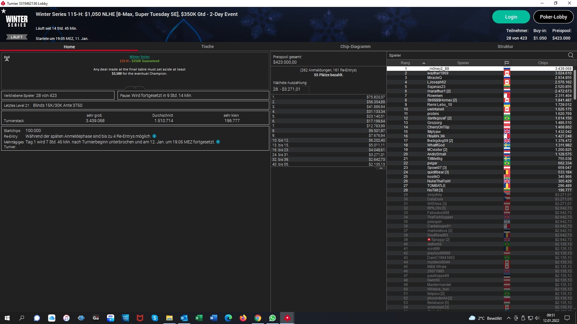 | Wed, 12 Jan | 14:15 | Event #121-H $1,050 6+ Hold’em [8-Max], $50K Gtd |