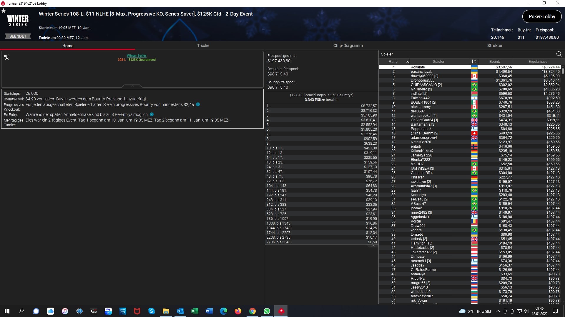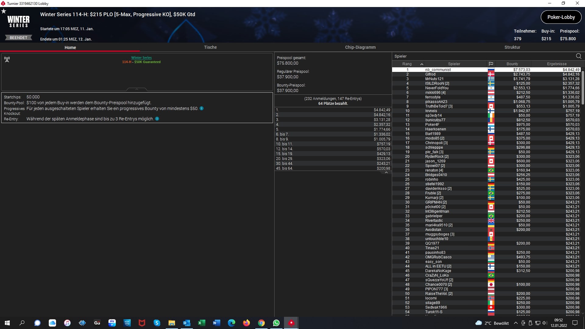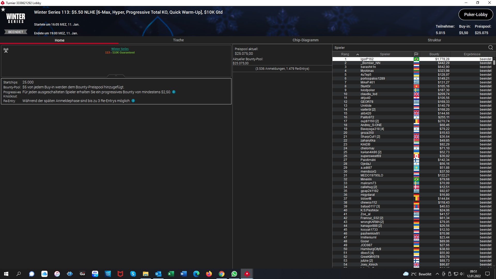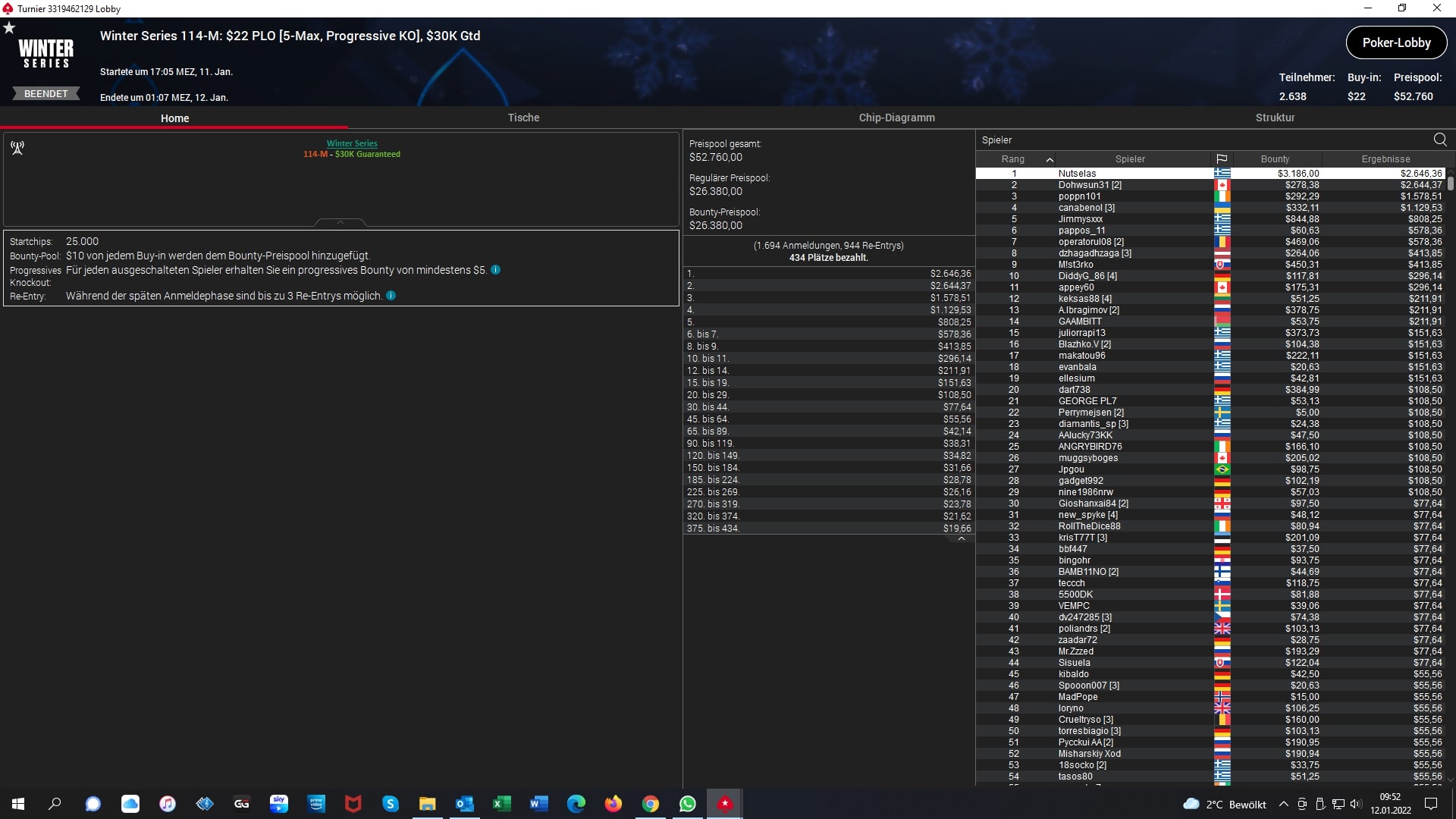 | Wed, 12 Jan | 15:05 | Event #122-L $5.50 NLHE [7-Max,][Hyper,][Progressive][KO,][Series][Wrap-Up], $50K Gtd |