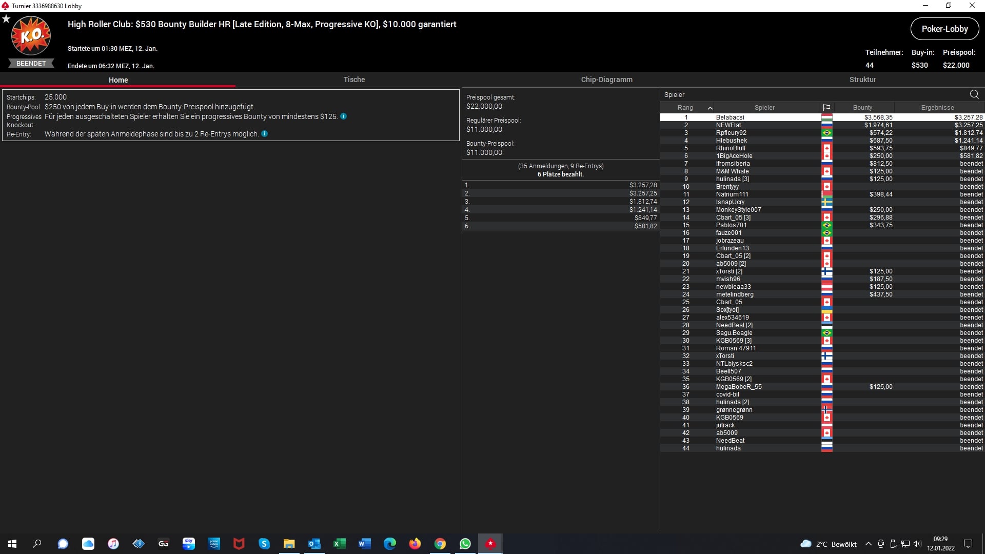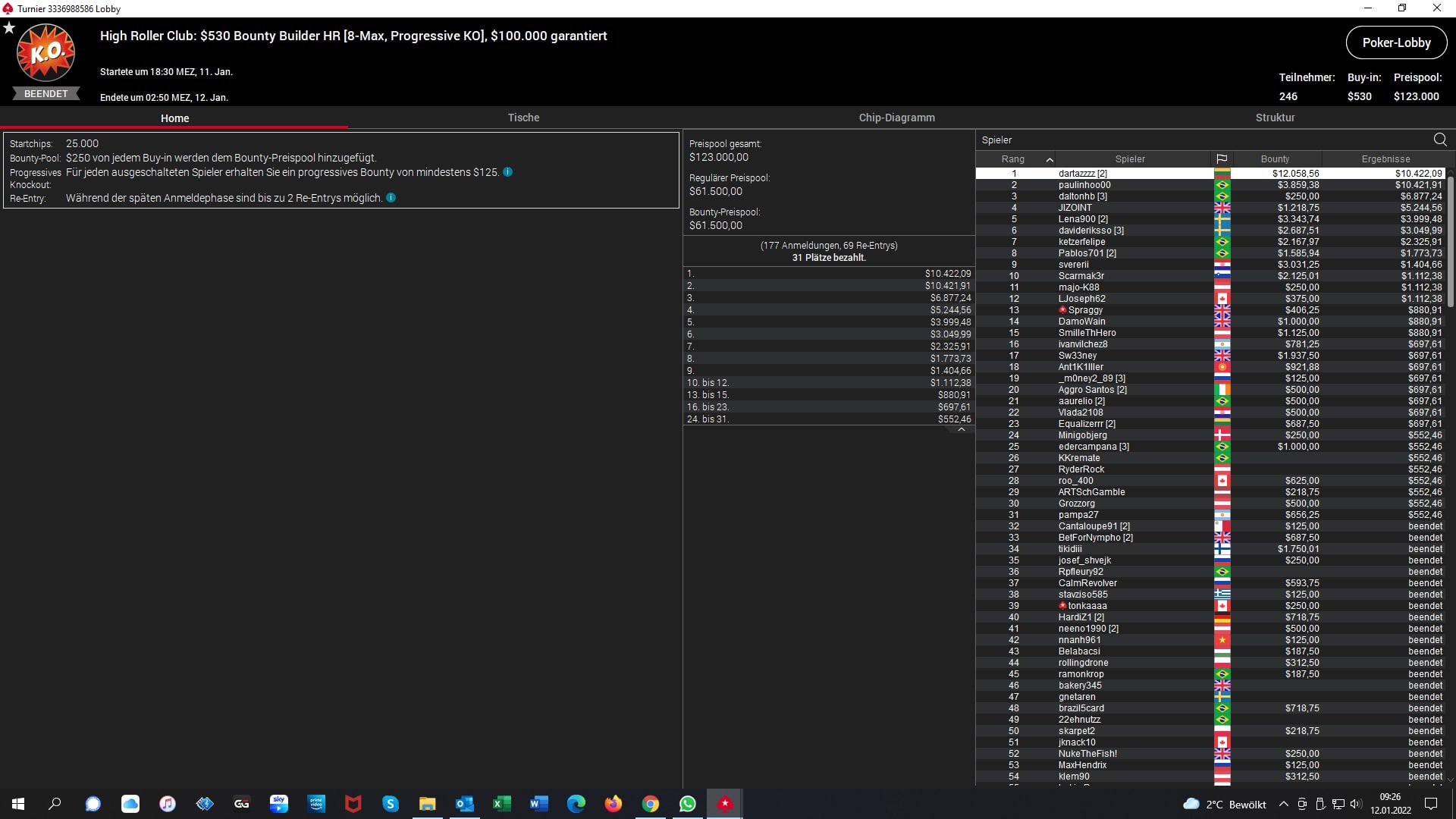 Beim größten Turnier des Tages im High Roller Club, dem $530 Bounty Builder High Roller setzte sich am Ende der Litauer „dartazzzz“ durch uns kassierte $10.422 + $12.058 Bounties.