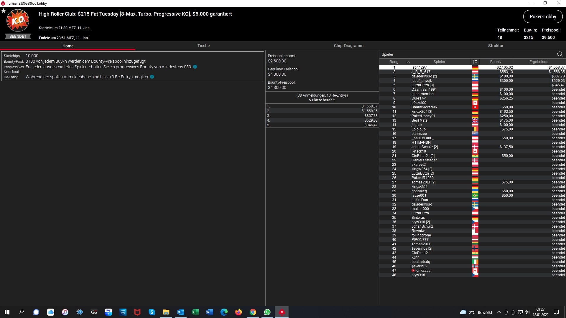 Am Dienstag war die Action im High Roller Club recht verhalten. Für die deutschsprachigen Online-Grinder gab es nur ein nennenswertes Ergebnis. Beim $215 Fat Tuesday konnte sich im Heads-Up der Deutsche „leon1297“ gegen den Österreicher „J_B_B_617“ (Rang 2 – $1.558 + $553 Bounties) durchsetzen und das Turnier für $1.558 + $2.165 Bounties gewinnen.