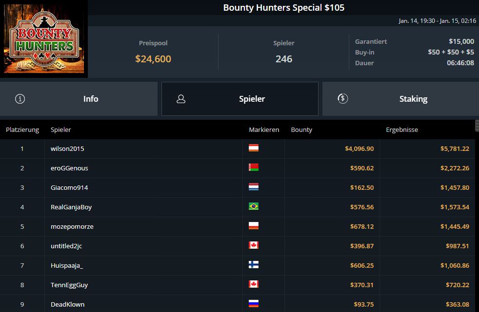 Einen ganz starken Lauf erwischte auch wilson2015. Der ebenfalls in Österreich ansässige Spieler schloss zunächst das $210 Bounty Hunters Special 6-Max (74 Entries) auf Platz drei für $1.668 ab, ehe er gut eine Stunde später das $105 Bounty Hunters Special (246 Entries) gewann und weitere $5.781 abräumte.