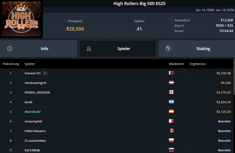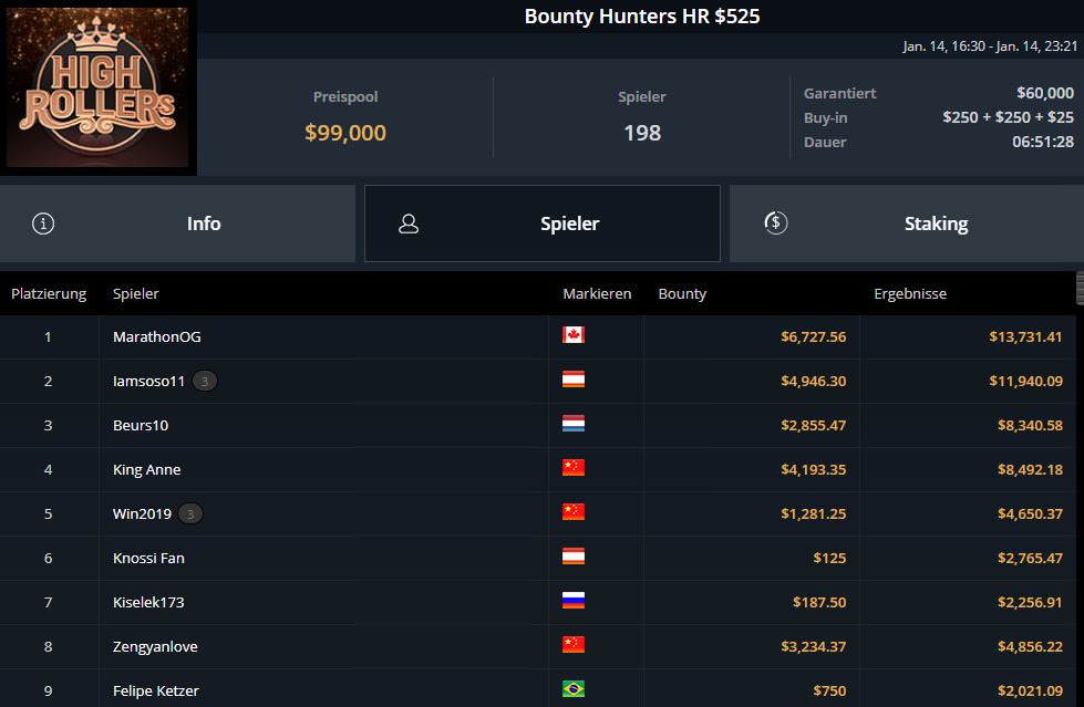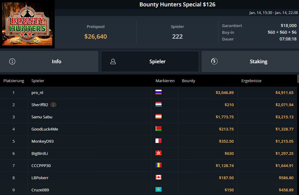 Den größten Scheck schnappte sich aus deutschsprachiger Sicht Iamsoso11. Beim $525 Bounty Hunters HR musste sich zwar MarathonOG ($13.731) aus Kanada geschlagen geben, aber Rang zwei brachte ihm inklusive Bounties bereits $11.940 ein.