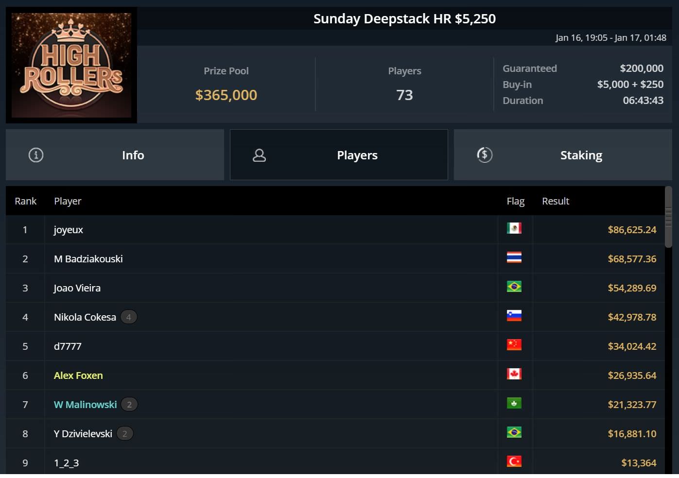Weitere Top-Platzierungen für DACH-Spieler gelangen Daniel Smiljkovic (Platz 4 beim $400 Forty Stack; rund $9.000), Thomas Mühlöcker (zweimal Platz 4 beim $5.250 Bounty Super High Roller und beim $1.500 GGMasters HR; $24.000 bzw. $63.000), Ole Schemion (Platz 7 beim $5.250 Bounty Super High Roller; $12.700) und Pascal Hartmann (Platz 4 beim $1.050 Sunday High Roller Main Event; $52.000).