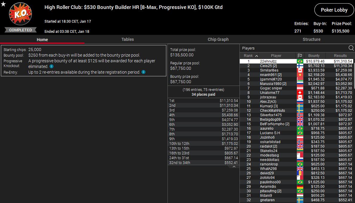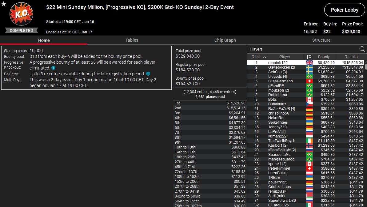 Gute Platzierungen gab es auch noch beim $530 Sunday Bounty Builder HR und beim $22 Mini Sunday Million PKO.