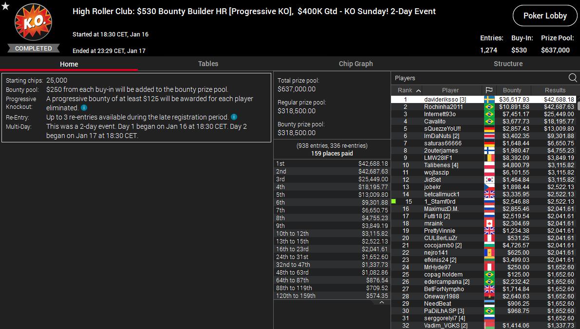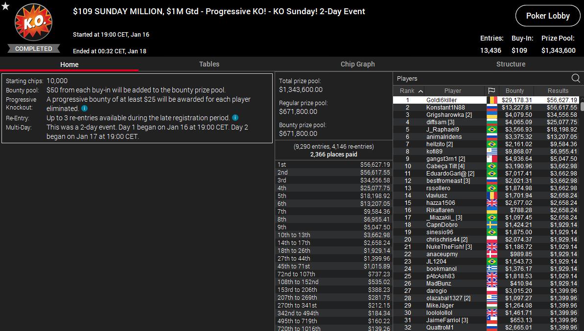 Der Großteil davon wurde am Montag verteilt und gangst3rn1 erreichte den Final Table der letzten sechs Spieler. Dort war dann aber schon auf Platz neun für $5.047,50 Preisgeld plus $4.936,64 Bounties wieder Schluss. Im Gegensatz dazu räumte der Belgier Goldi6killer für den Sieg $56.627,19 Prämie plus $29.178,31 an Bounties ab.