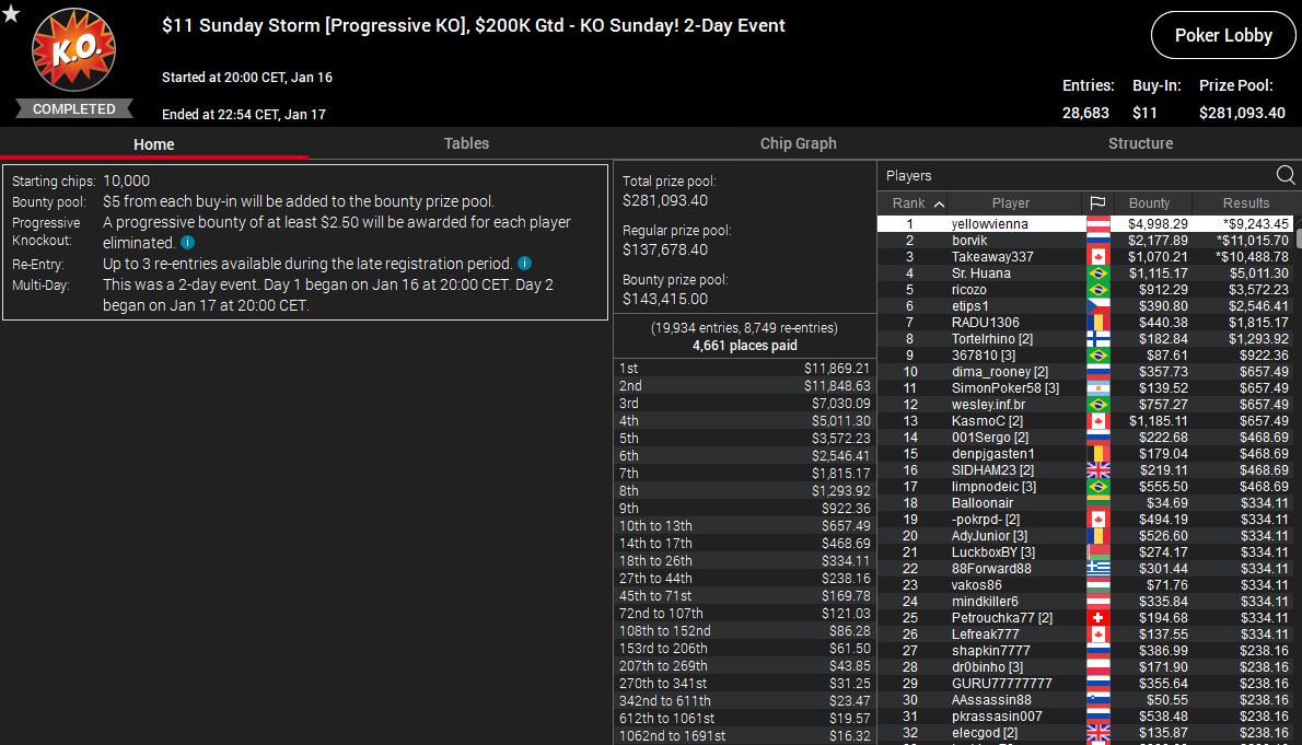Einen riesigen Erfolg feierte yellowvienna aus Österreich beim $11 Sunday Storm PKO. Hier gab es 28.683 Entries, der Preispool lag somit bei $281.093. Nach einem Deal zu dritt zeigte yellowvienna das beste Finish. Zwar kassierte er trotz Sieg mit $9.243,45 nicht das höchste Preisgeld, dafür aber mit $4.998,29 das mit Abstand höchste Kopfgeld.