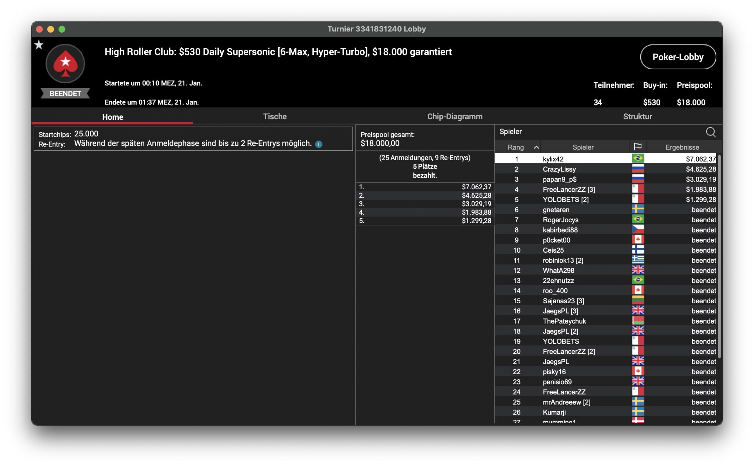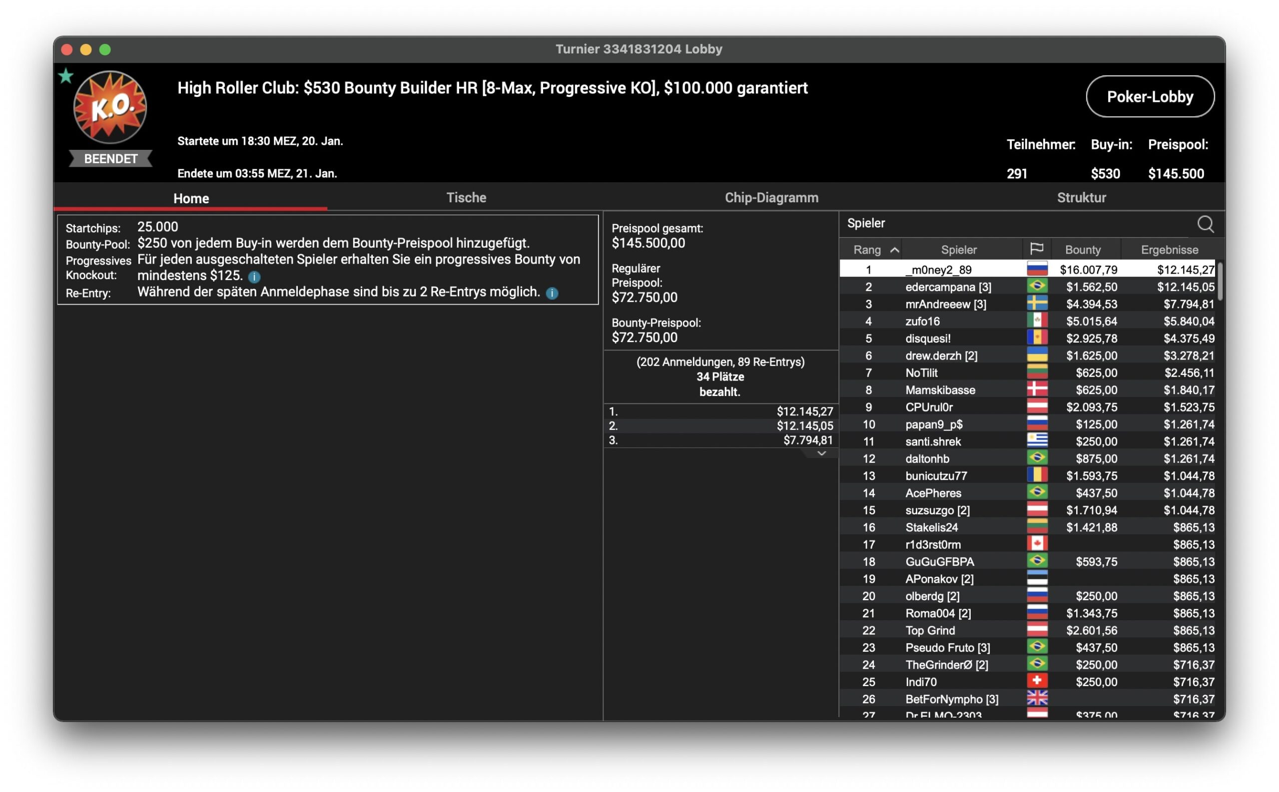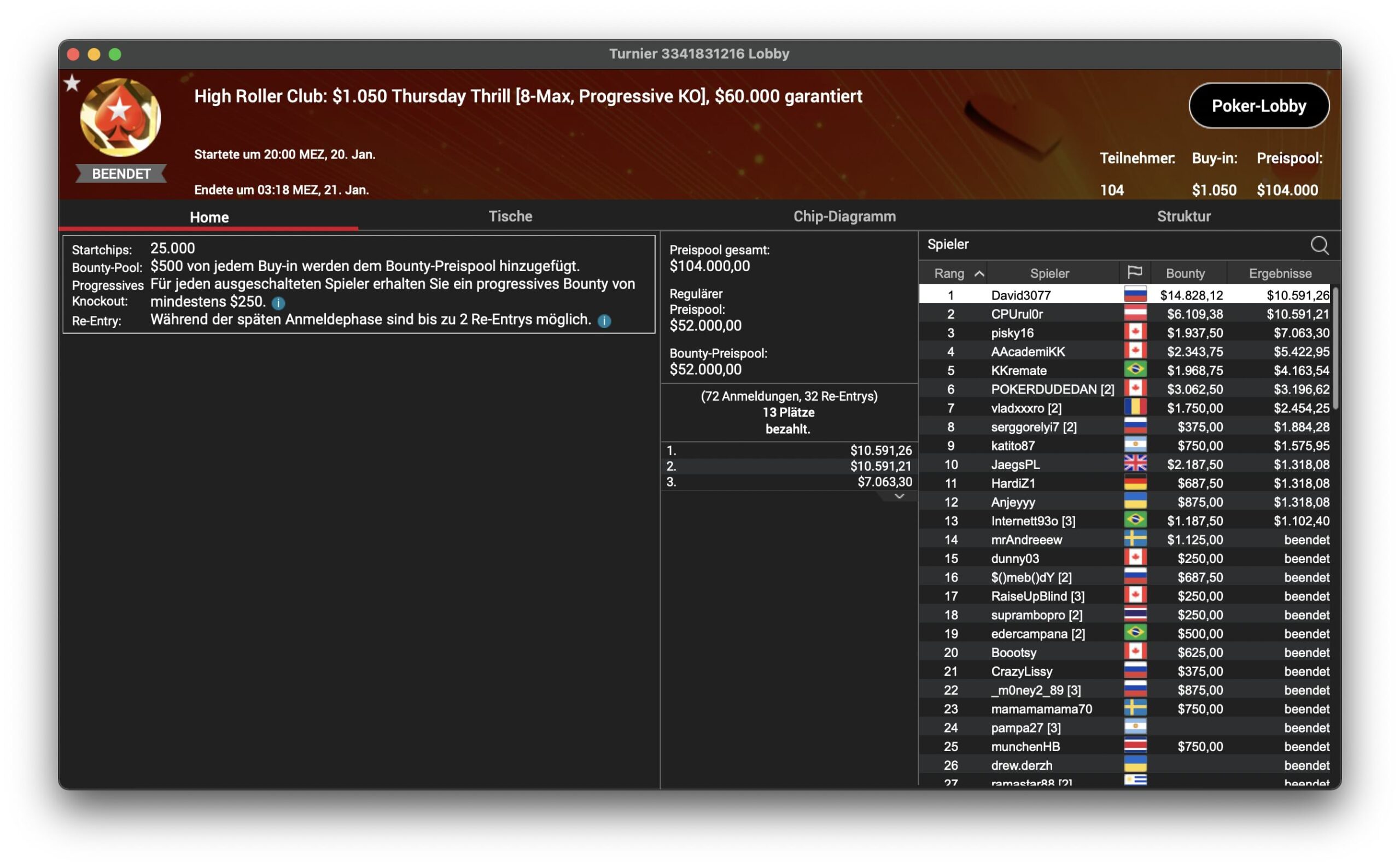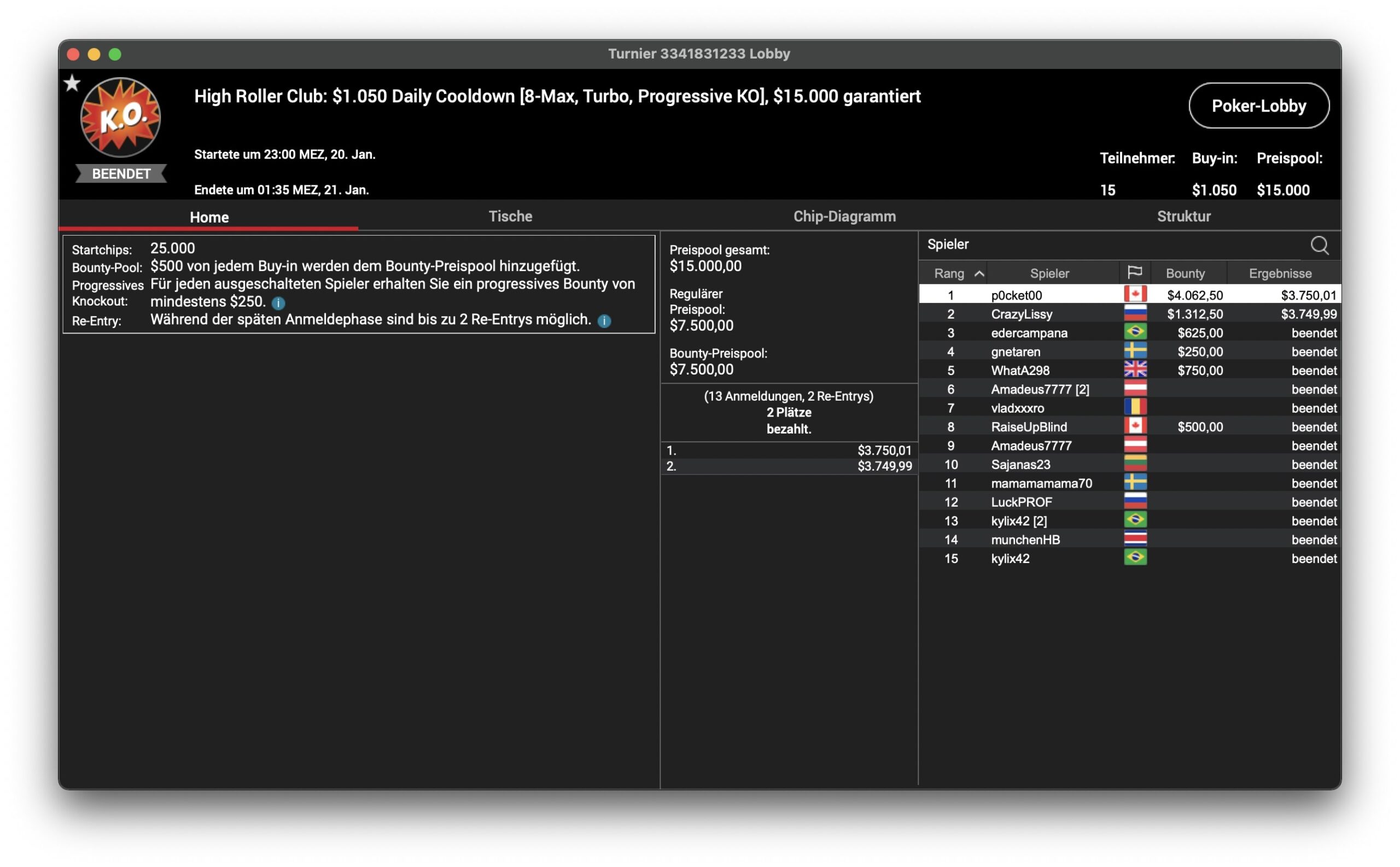 Beim $1.050 Daily Cooldown trafen sich drei High Roller Club-Dauergäste auf dem Treppchen: Der Kanadier Sebastian „p0cket00“ Sikorski und der Russe „CrazyLissy“ sowie Eder „edercampana“ Campana aus Brasilien. Letzerer musste sich auf Platz 3 mit einem Bounty und $625 zufrieden geben. „CrazyLissy“ wurde Runner-Up für $1.312 + $3.749 und der Sieg für Sikorski brachte $4.062 + $3.750 ein.