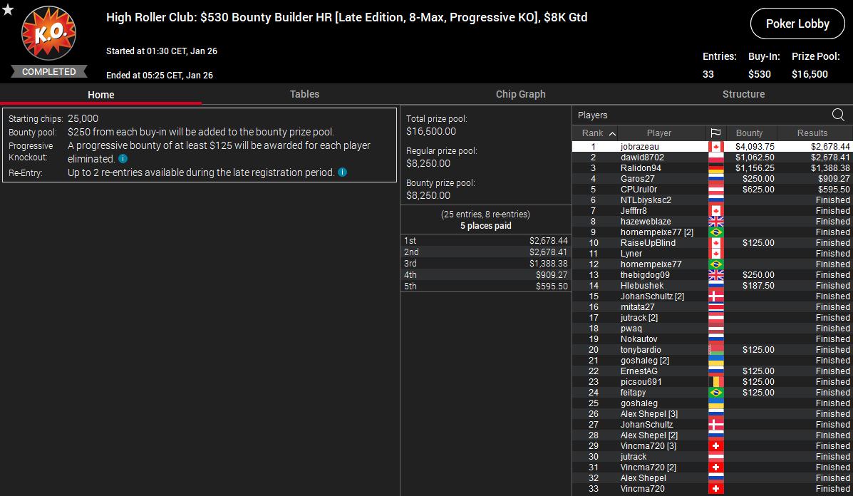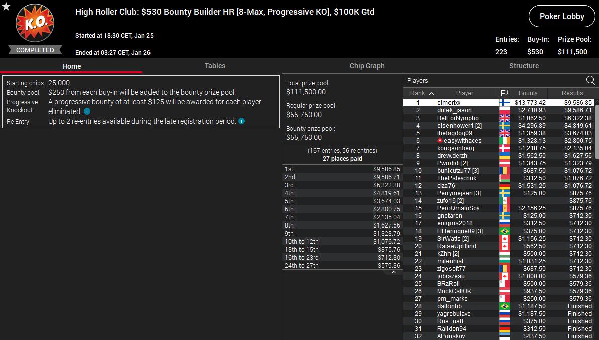 Den größten Preispool gab es wie gewohnt beim $530 Bounty Builder HR ($111.500). Den Sieg für insgesamt $23.360,27 feierte der Finne Tomi elmerixx Brouk, Platz fünf ging an Team PokerStars Pro Fintan easywithaces Hand ($4.128,89). Der Deutsche ciza76 ($2.607,97) musste sich dagegen mit Platz zwölf begnügen.