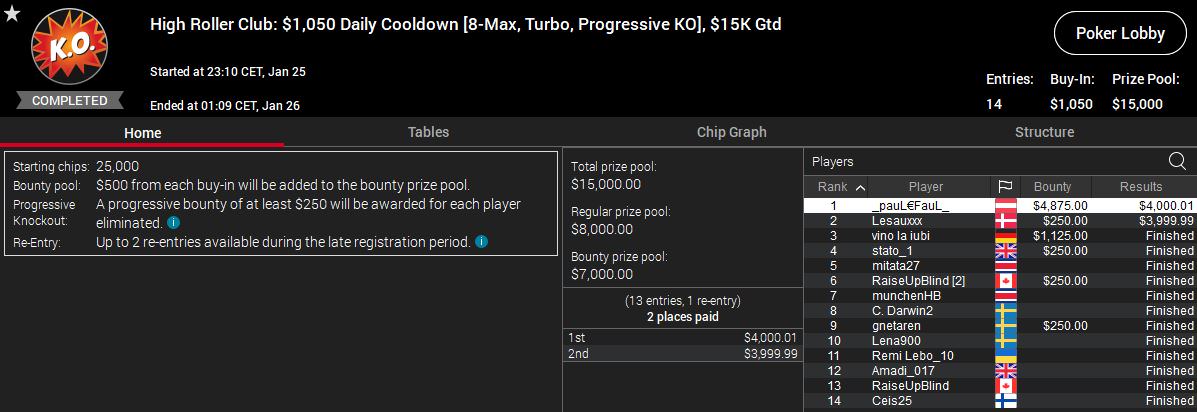 Den Sieg feierte Paul _pauL€FauL_ Höfer beim $1.050 Daily Cooldown. Bei 14 Entries ging es aber ‚nur‘ um die garantierten $15.000, wovon letztlich inklusive Bounties $8.875 an den deutschen Pro gingen.