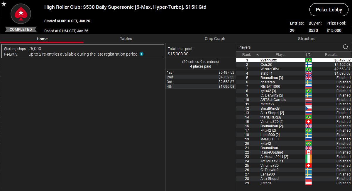Im High Roller Club von PokerStars wurden am Dienstag sechs Turniere gespielt, wobei die Ausbeute der deutschsprachigen Spieler trotz Turniersieg übersichtlich war.