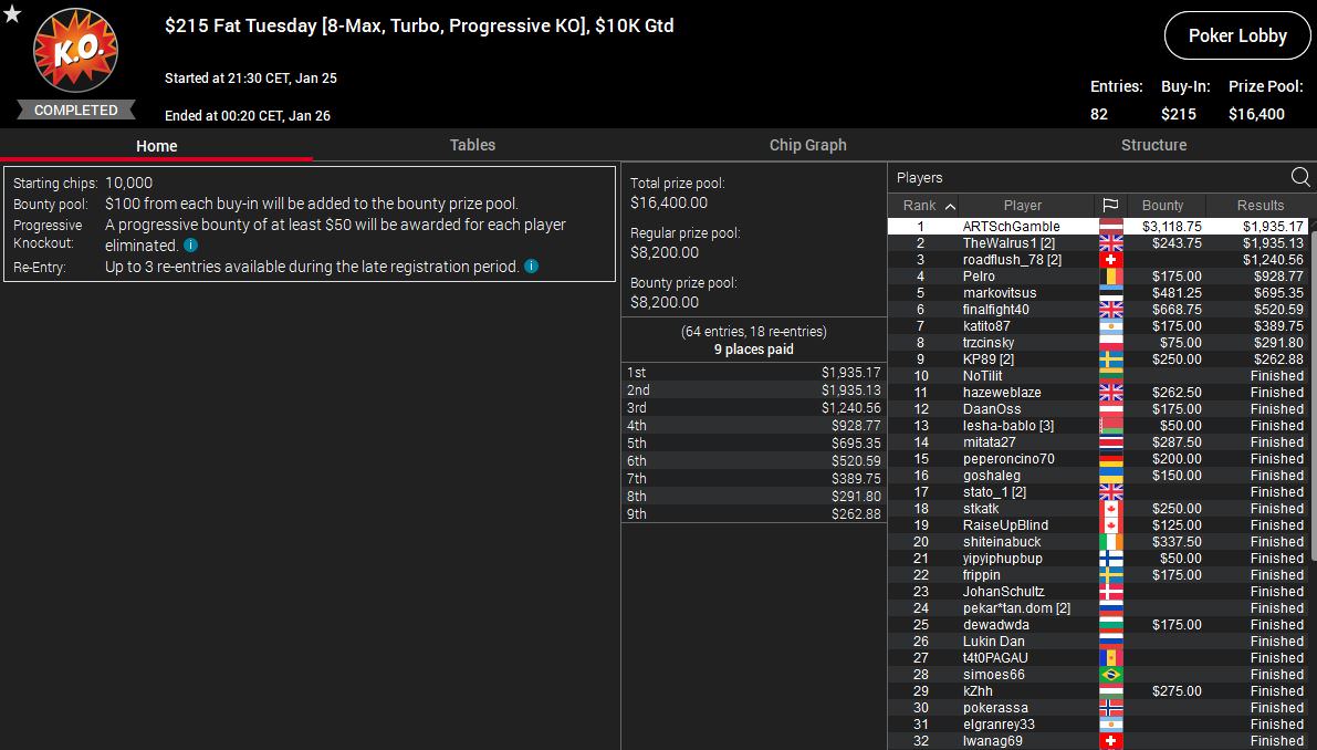 Beim $530 Bounty Builder HR Late Edition belegten Ralidon94 ($2.544,63) und CPUrur ($1.220,50) die Plätze drei und fünf, der Schweizer roadflush_78 ($1.240,56) beendet das $215 Fat Tuesday ebenfalls auf Platz drei.