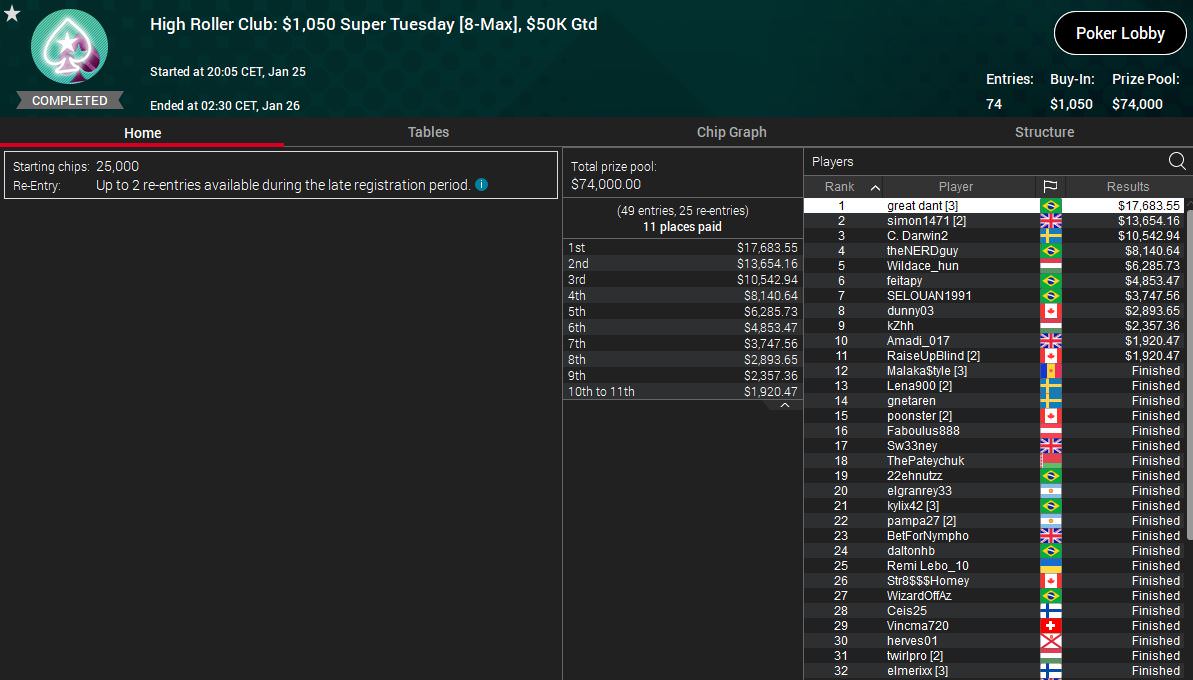 Das $1.050 Super Tuesday ging diesmal an Bruno great dant Volkmann ($17.683,55) aus Brasilien, die deutschsprachigen Teilnehmer gingen hier komplett leer aus.