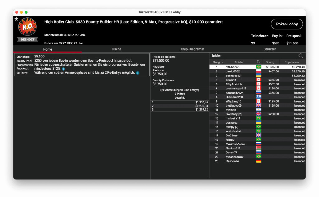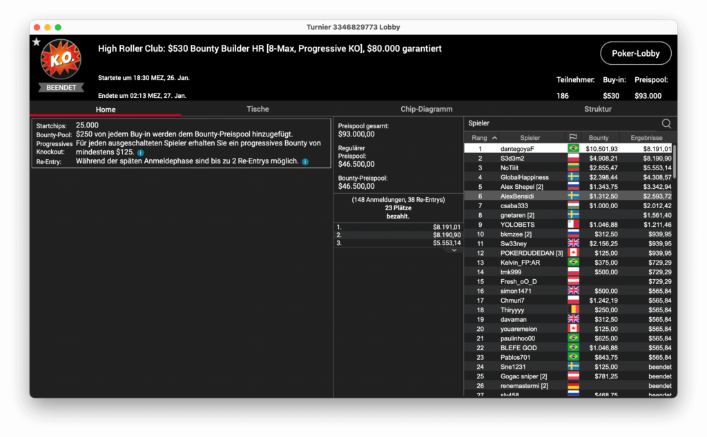 Dante „dantegoyaF“ Goya aus Brasilien konnte sich das klassischerweise im High Roller Club größte Turnier, das $530 Bounty Builder HR, schnappen und $10.501 + $8.191 einstecken. Jens Lakemeier cashte auch hier, auf Platz 15 war er der beste DACH-Spieler für $729.