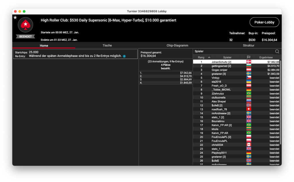 „Gogac sniper“ konnte sich beim $530 Daily Supersonic immerhin auf Platz 3 spielen und dort $2.884 cashen. Der Däne „JohanSchultz“ entschied das 32-Entry starke Turnier für $7.062 für sich.