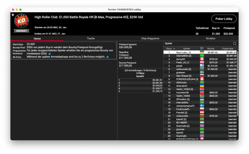 Das $1.050 Battle Royale ging an Pavel „Remi Lebo_10“ Kolinkowski aus der Ukraine, der für seinen Sieg $8.687 + $5.681 abstauben konnte. 35 Entries waren angetreten, $35.000 lagen im Preispool. Jens „Fresh_oO_D“ Lakemeier durfte sich auf Platz 4 über schmale $375 + $1.928 freuen.