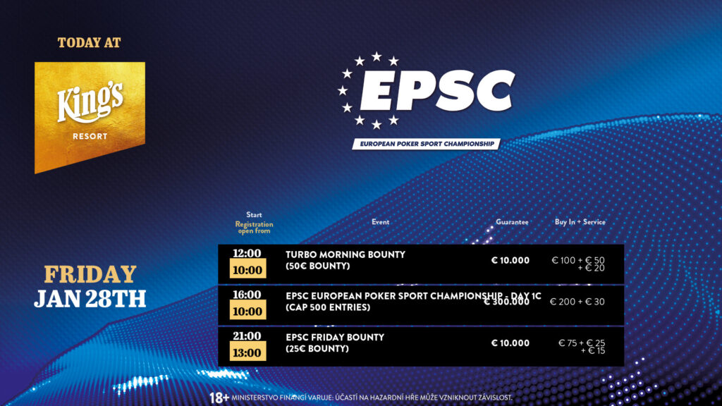 | FR. 28. 1. 16:00 | EPSC EUROPEAN POKER SPORT CHAMPIONSHIP - DAY 1C (CAP 500 ENTRIES) | 300000 | €200 + €30 |